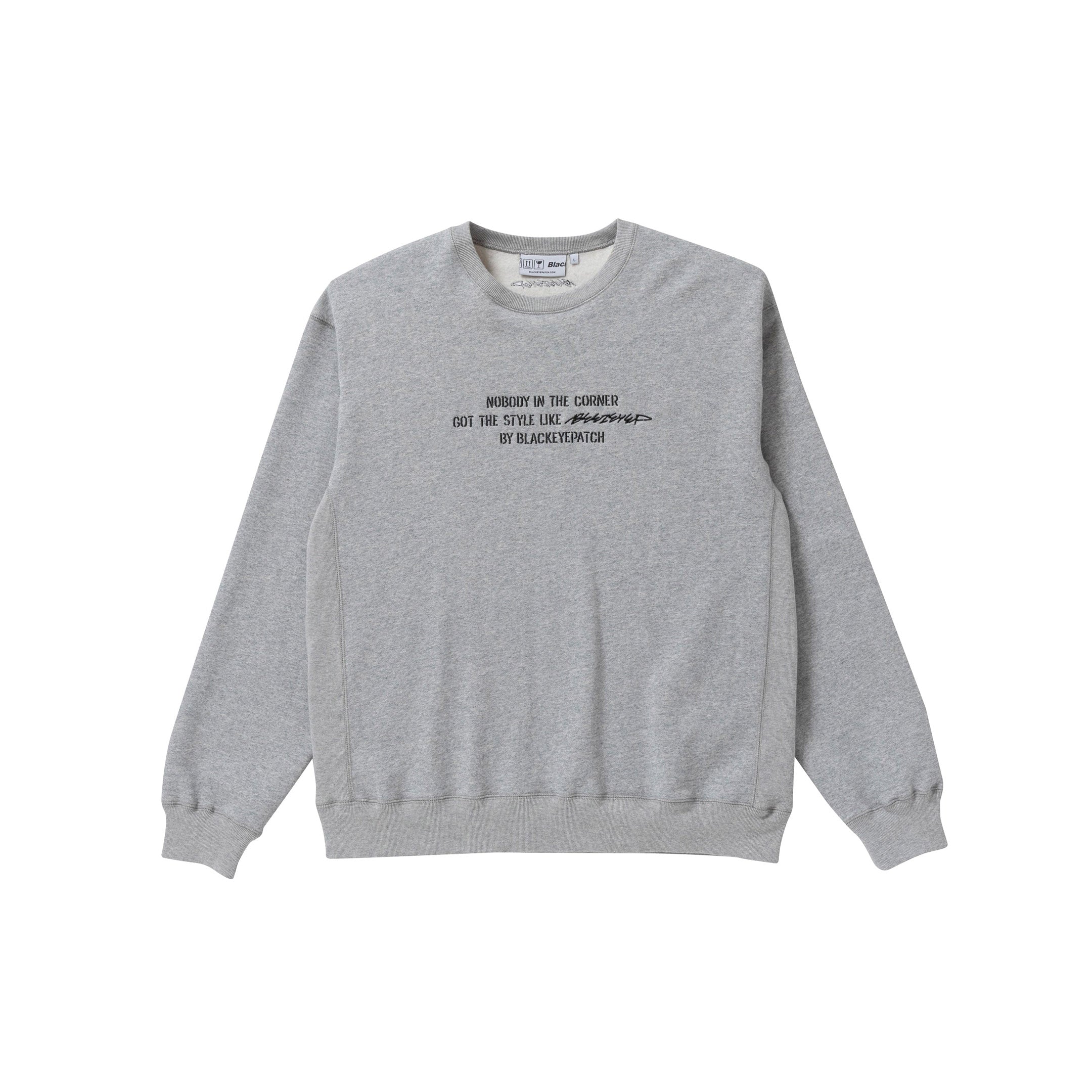 "BlackEyePatch" を表すスラング "BEEZ-EYE-P" のグラフィックとメッセージをフロント部分に刺繍した CREW SWEAT。