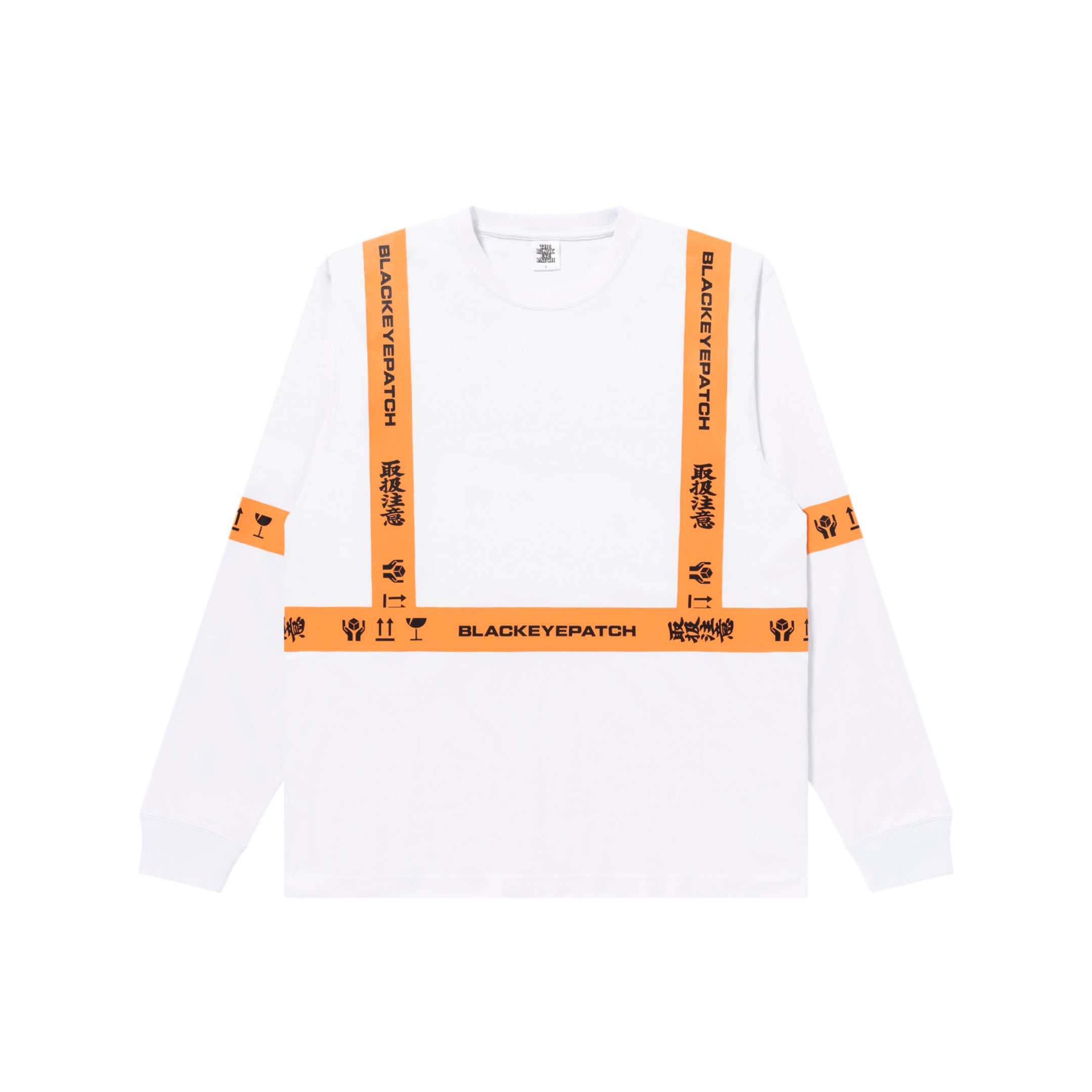 ブランドロゴやアイコンが配置された業務用テープのグラフィックをセーフティージャケットの様な配置にプリントしたロングスリーブ T シャツ。