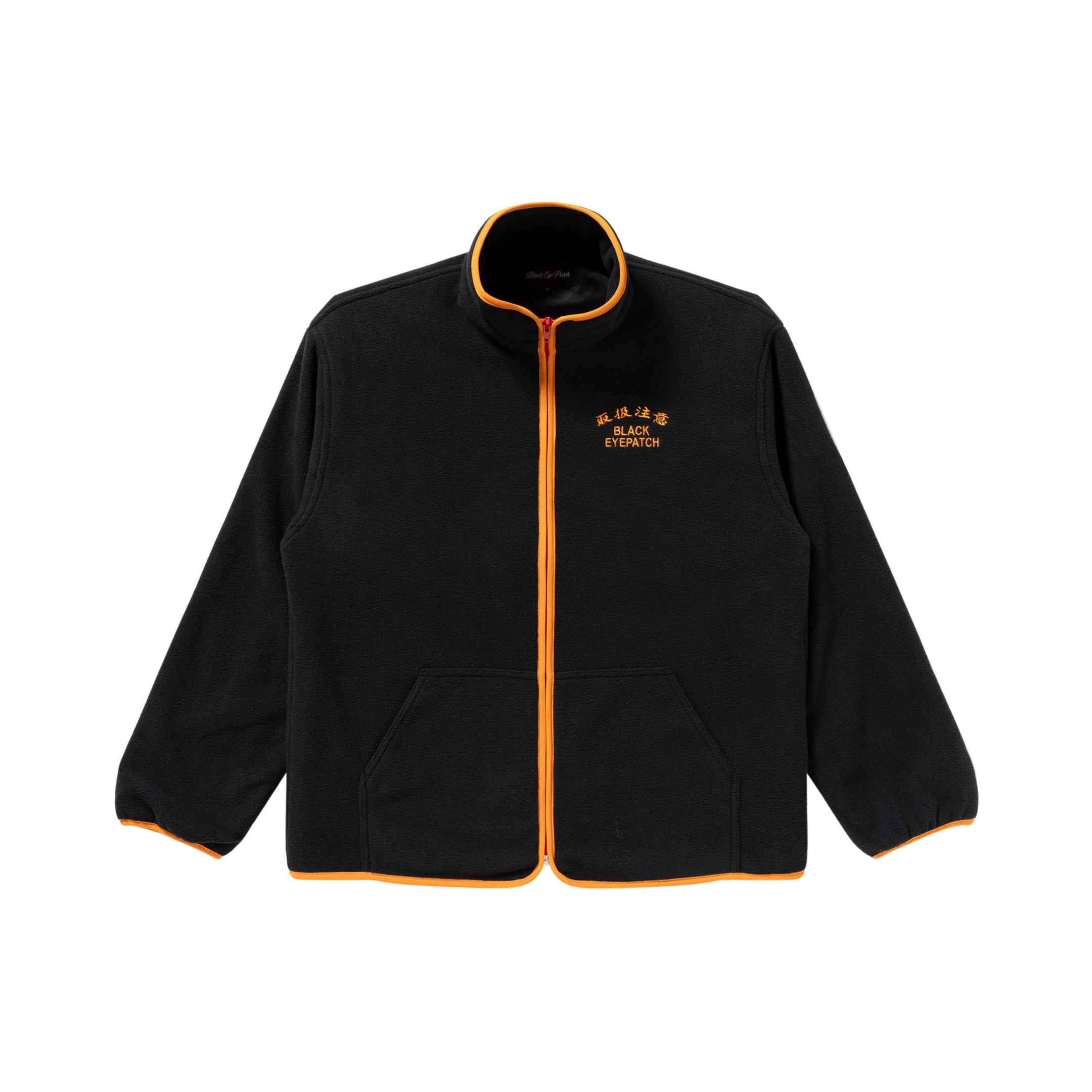ブランドネームと "取扱注意" のグラフィックがフロント、バックに刺繍されたフリースジャケット。