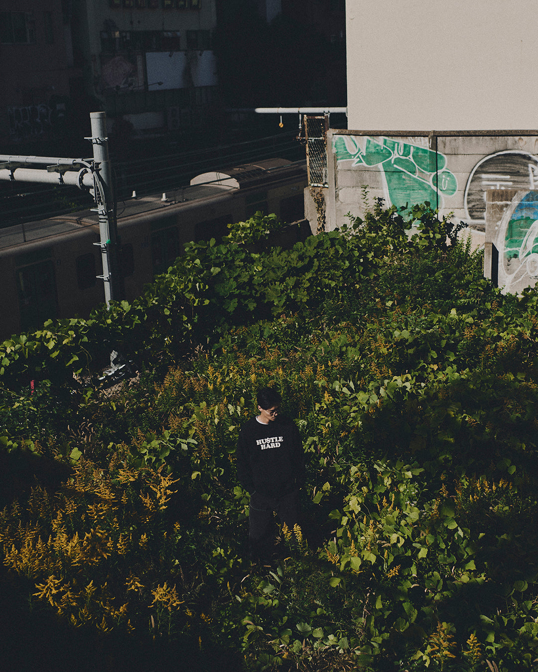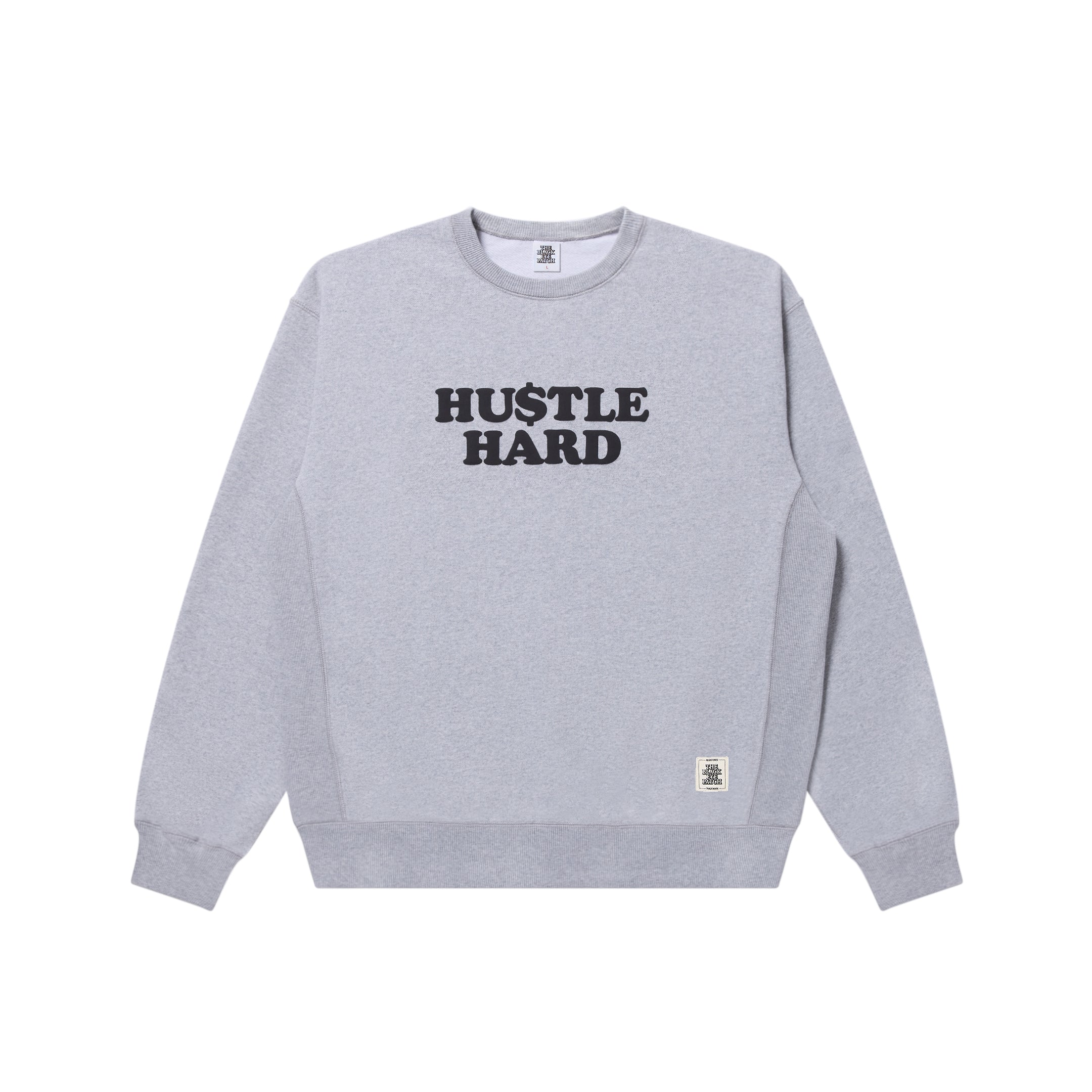 フロントに "HUSTLE HARD" のメッセージが、背中には同じフォントでブランド名がプリントされたクルーネックスウェット。