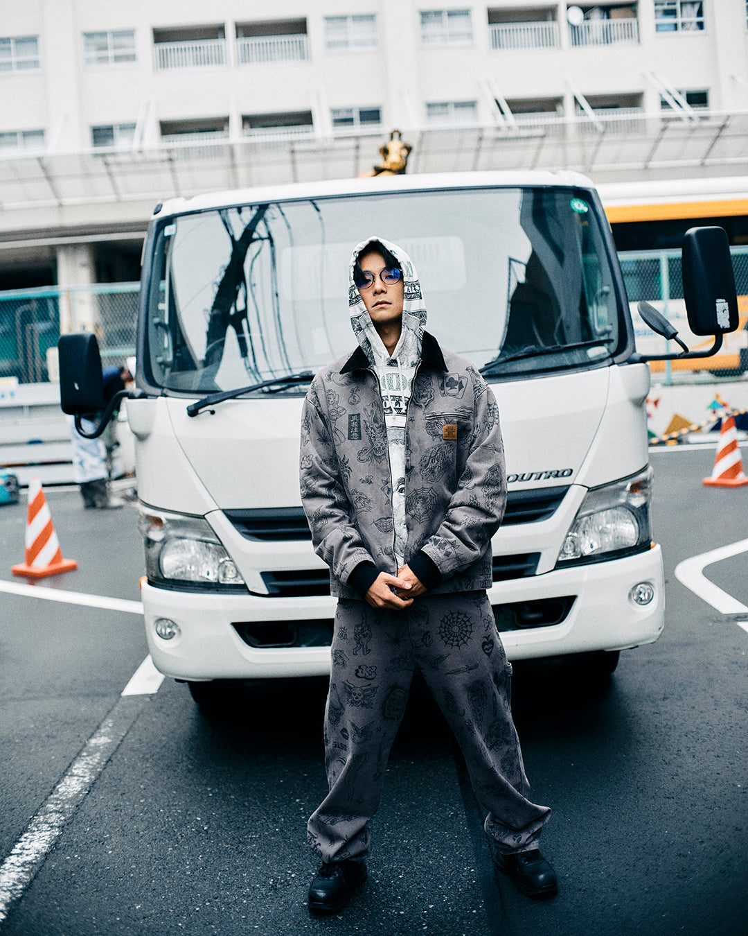 タトゥーアーティストの UE 氏のグラフィックがプリントされたダック生地ワークジャケット。