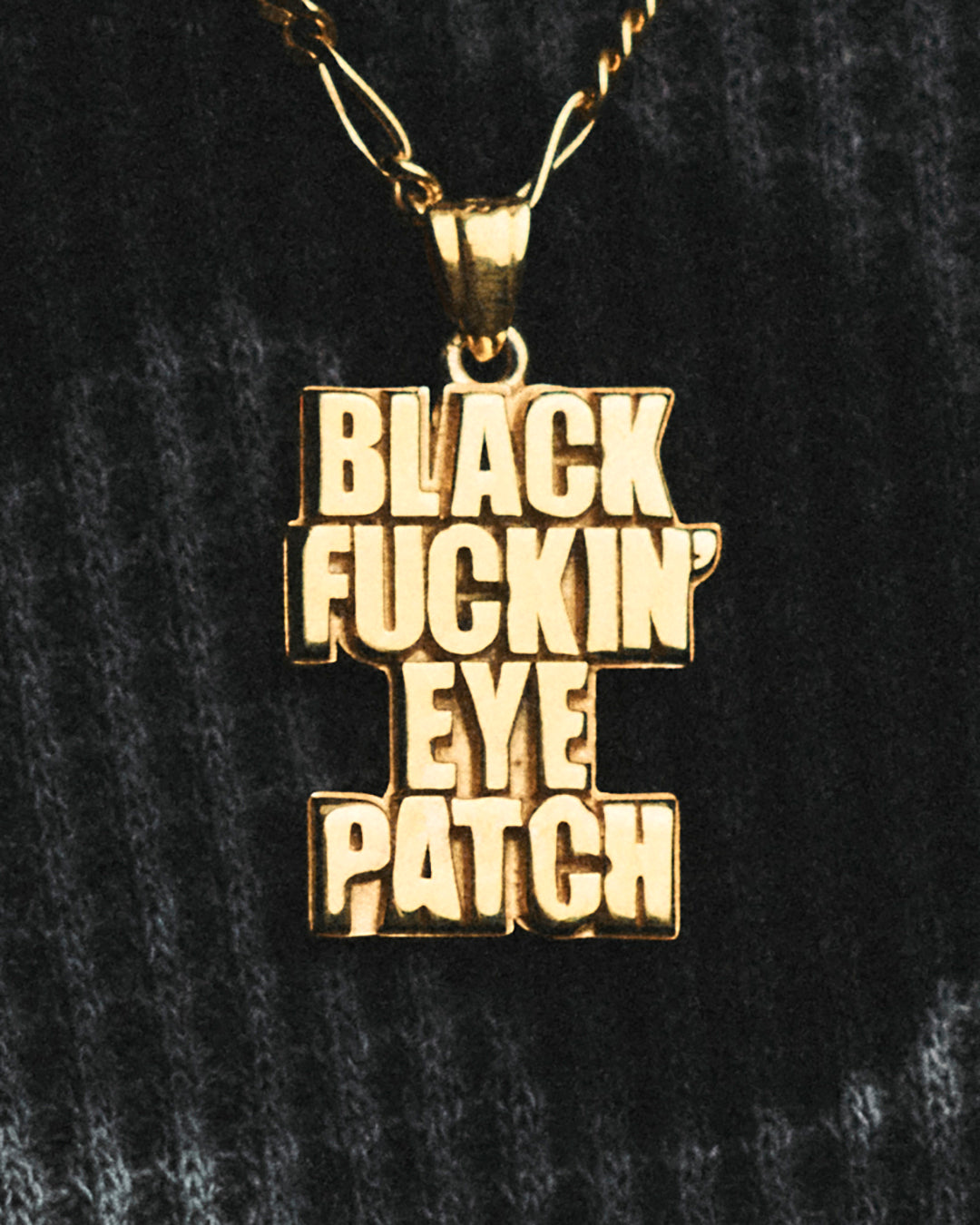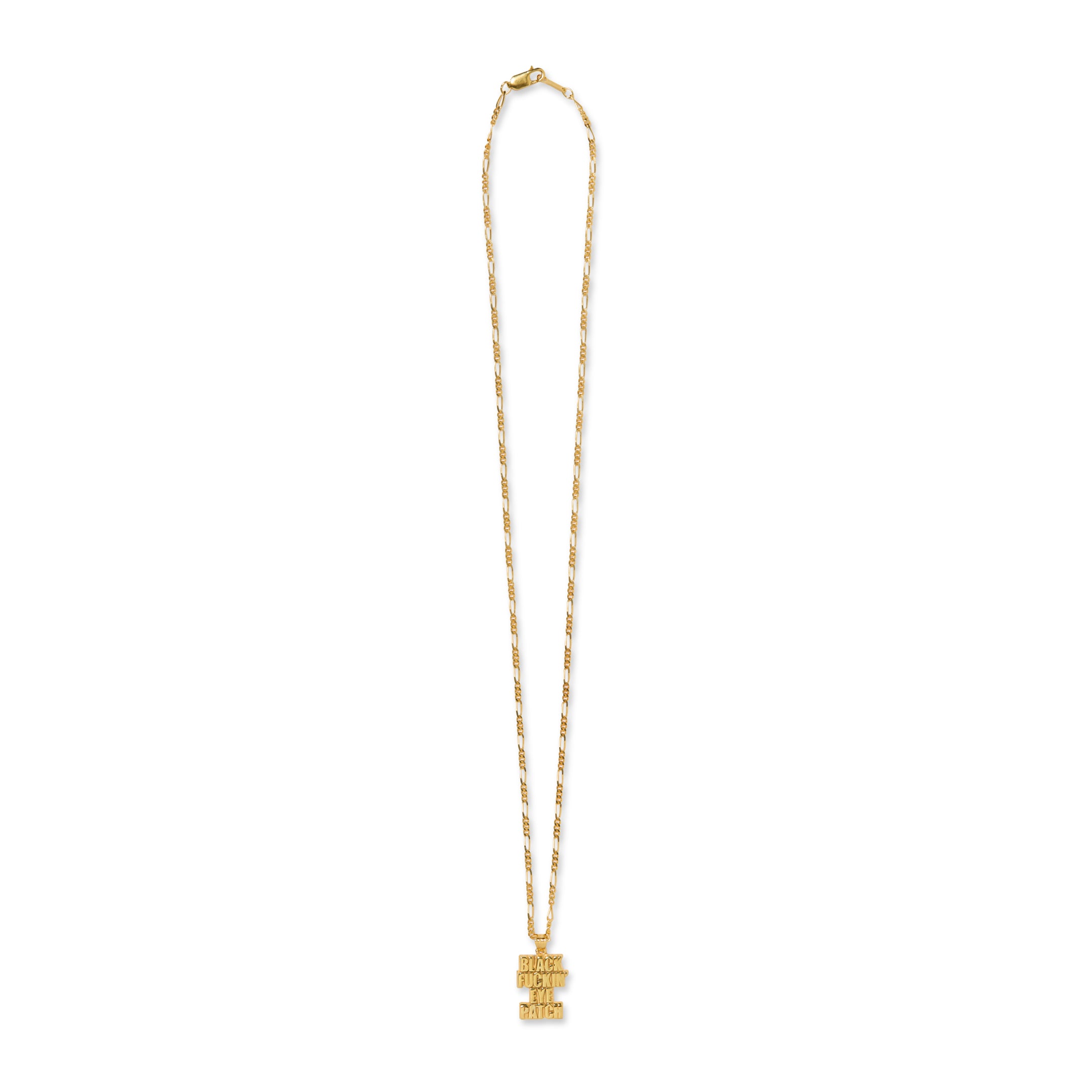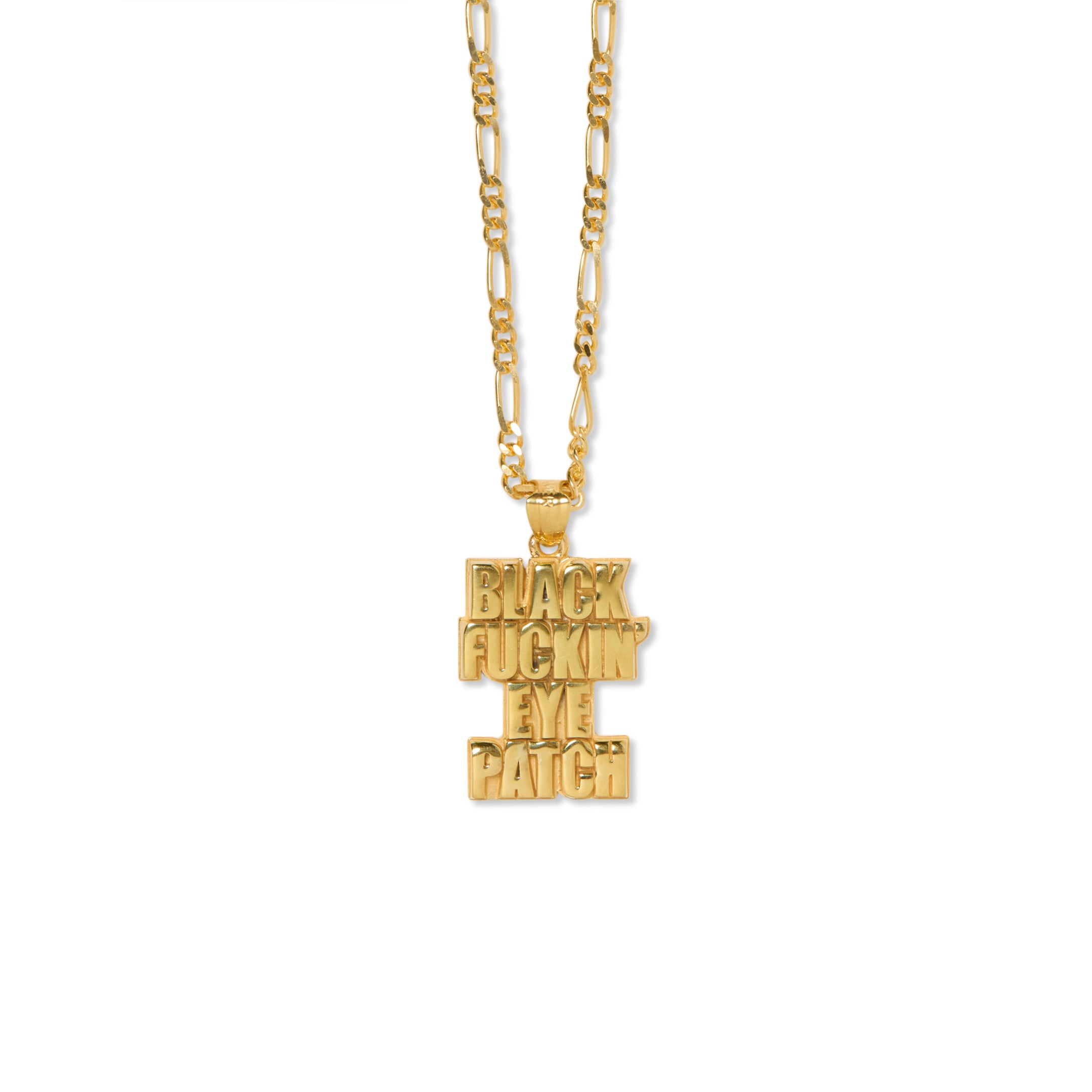 Gold-plated pendant necklace featuring a graphic design of a "BLACK FUCKIN’ EYE PATCH". A 50cm Figaro chain is used.