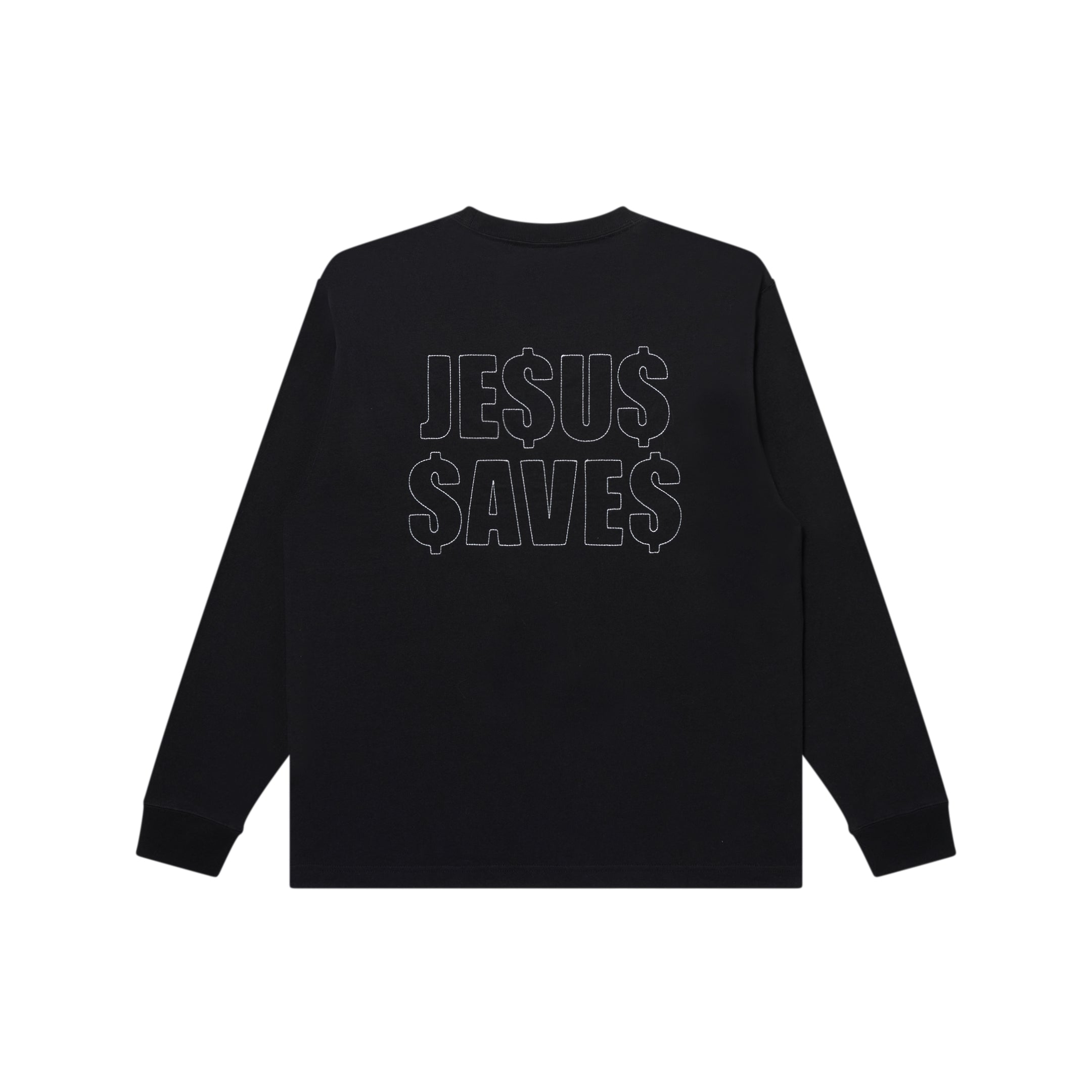 フロントはジーザスのグラフィック、背面には "JESUS SAVES(ジーザスが救ってくれる)" というメッセージがステッチ刺繍で施されたロングスリーブ T シャツ。