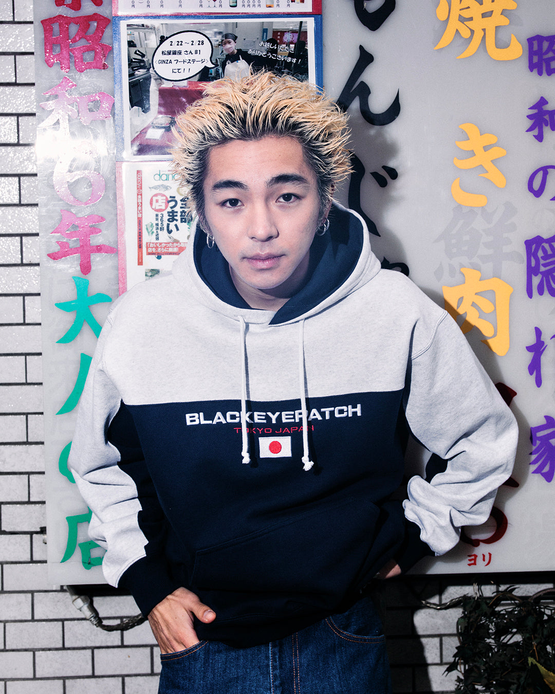 90's サンプリングながら日本国旗を落とし込んだ BlackEyePatch らしいアイデンティティが詰め込まれたグラフィックをフロントに刺繍した切り替えのディテールが特徴のプルオーバーフーディー。