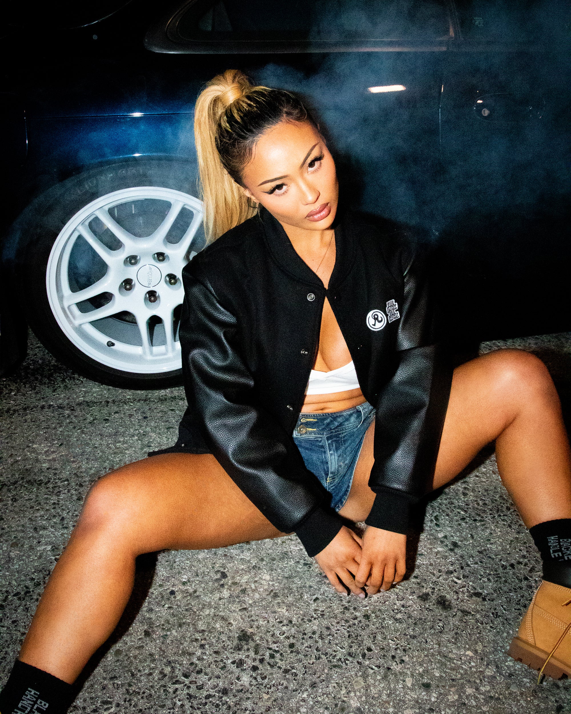 A collaboration with "Richardson," launched by Andrew Richardson, founder of the New York art and culture magazine "Richardson Magazine," which debuted in 1998. Varsity jacket featuring a sagara embroidered patch with Richardson's "R" logo and BEP's "Handle with Care" graphic. Melton body with leather sleeves.