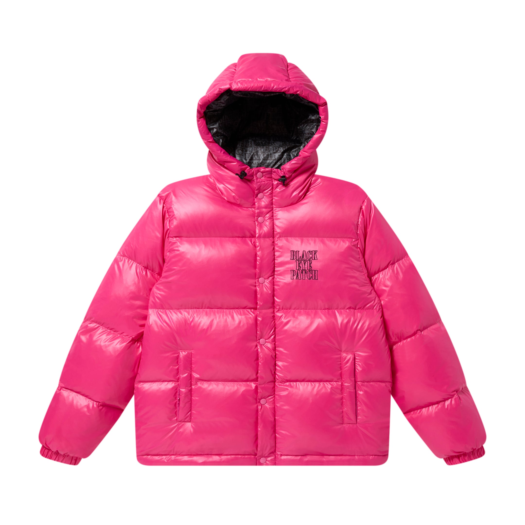 Hooded down jacket crafted from high-quality nylon featuring a stencil logo embroidered on the chest. The inner layer features an all-over print with the "OG LABEL" logo. Available in two colors: black and pink.