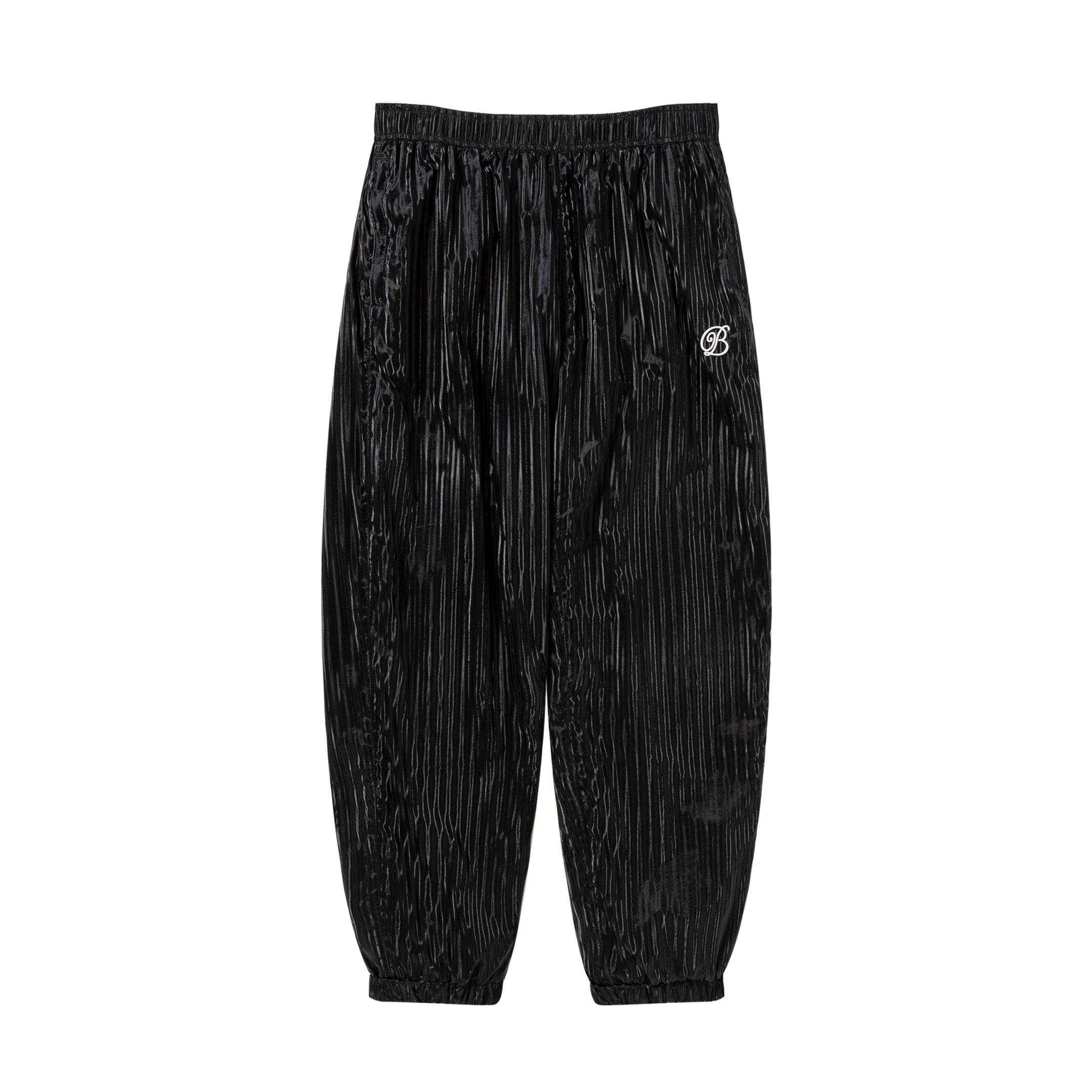 独特な光沢感のある生地を使用し、左ポケット部分に "B" エンブレムロゴ刺繍を施した定番のトラックパンツ。共地のトラックジャケットとセットアップでの展開。
