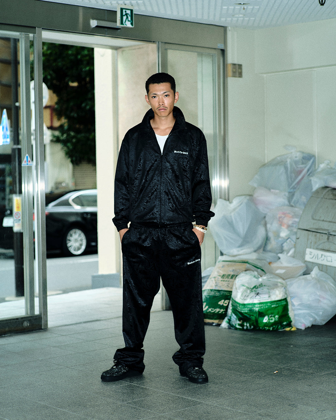ペイズリー柄がエンボスされたベロア生地を使用したトラックパンツ。