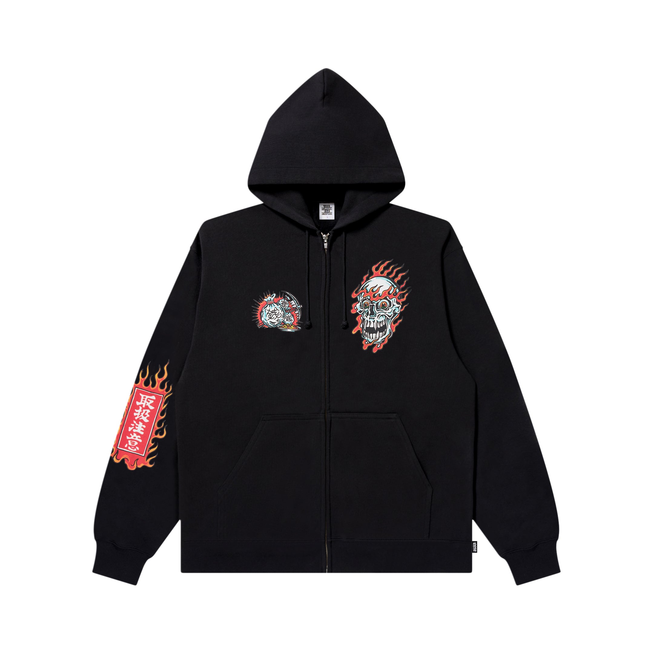 タトゥーアーティストの UE 氏のグラフィックが両胸、右袖 、背中にプリントされたジップアップフーディ。