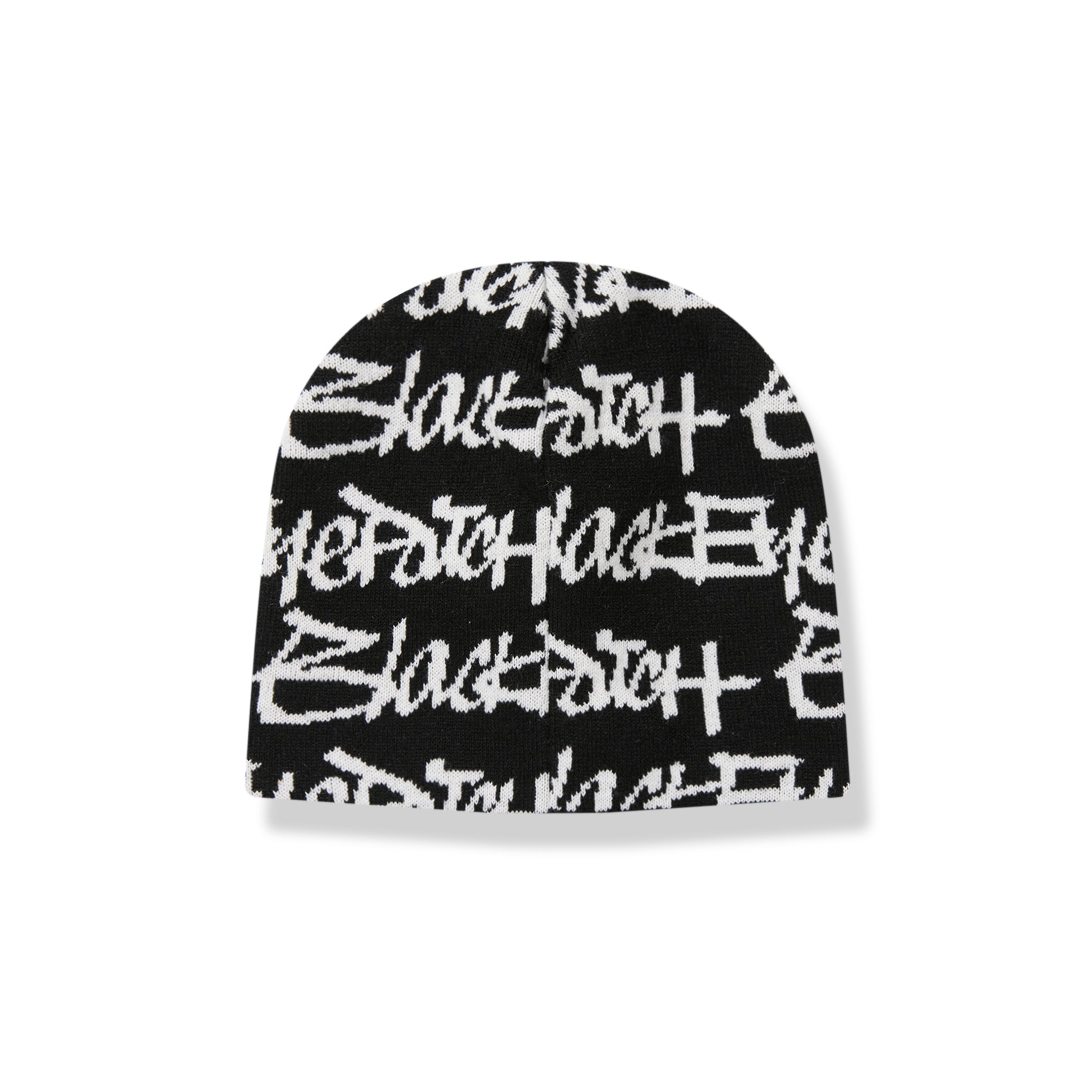 A single-knit beanie featuring an all-over pattern with the brand name rendered in a tag-style graphic using jacquard weaving.