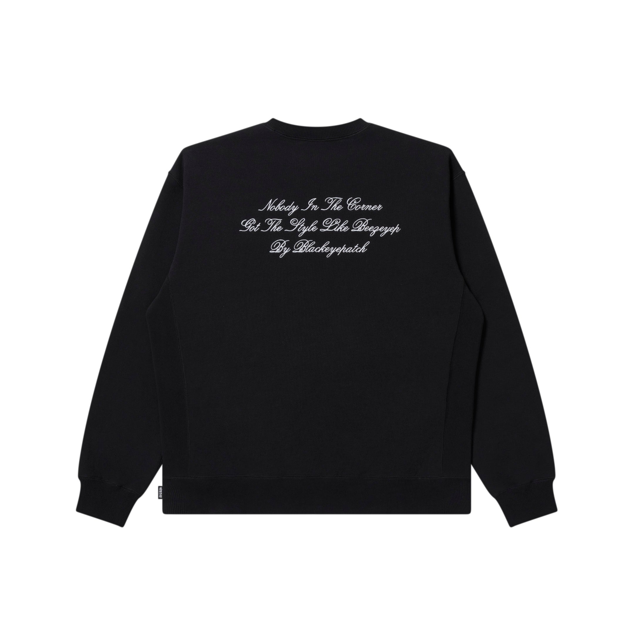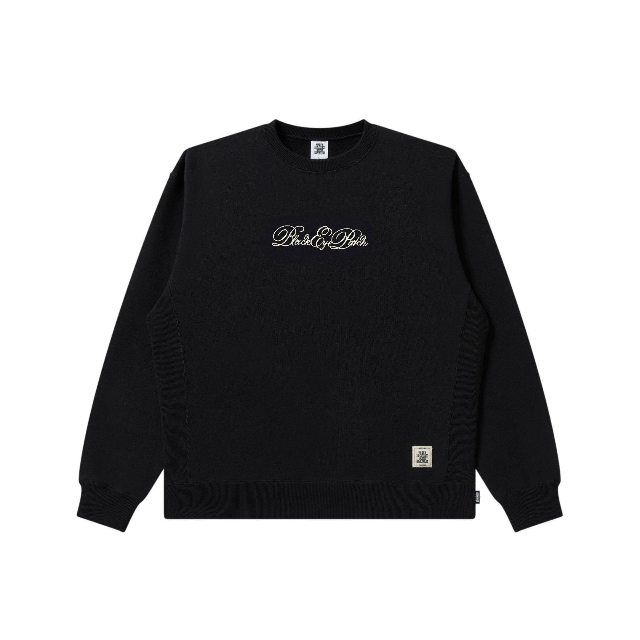 A crew neck sweatshirt with the brand logo in a cursive font on the front and a message embroidered on the back.