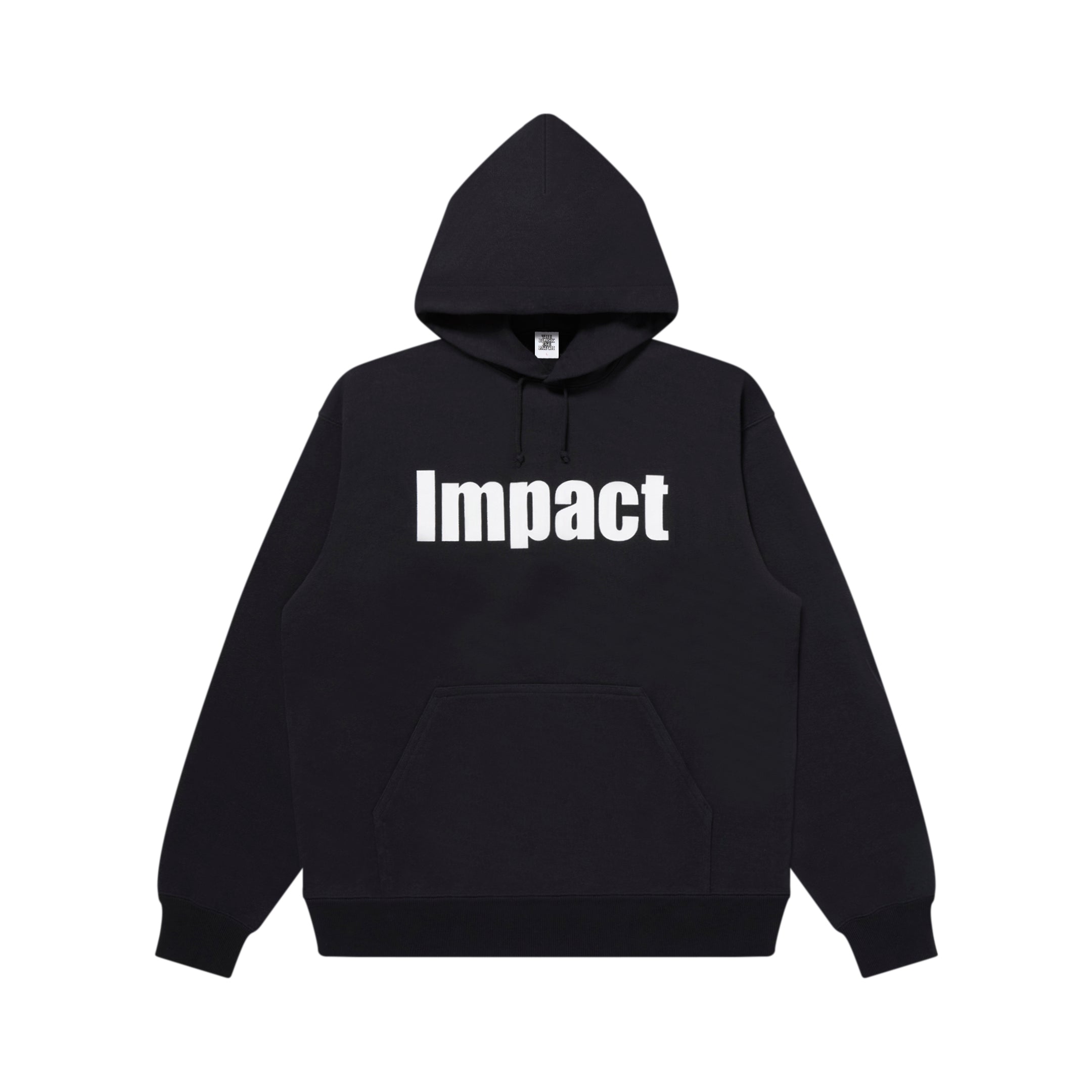 Impact フォントを使用して「Impact」の文字をプリントしたプルオーバーフーディ。