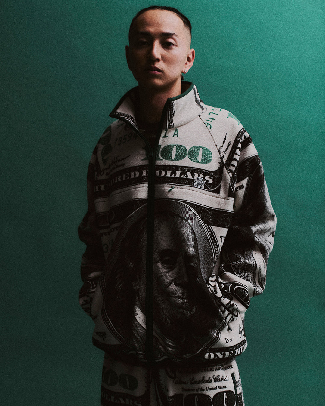 Jacket made of microfleece with a full-print design of $100 bills all over. Available as a pants in the same design.