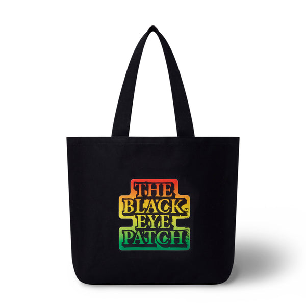 A tote bag featuring a gradient print of the "OG LABEL" logo in tropical, Rastafarian colors.