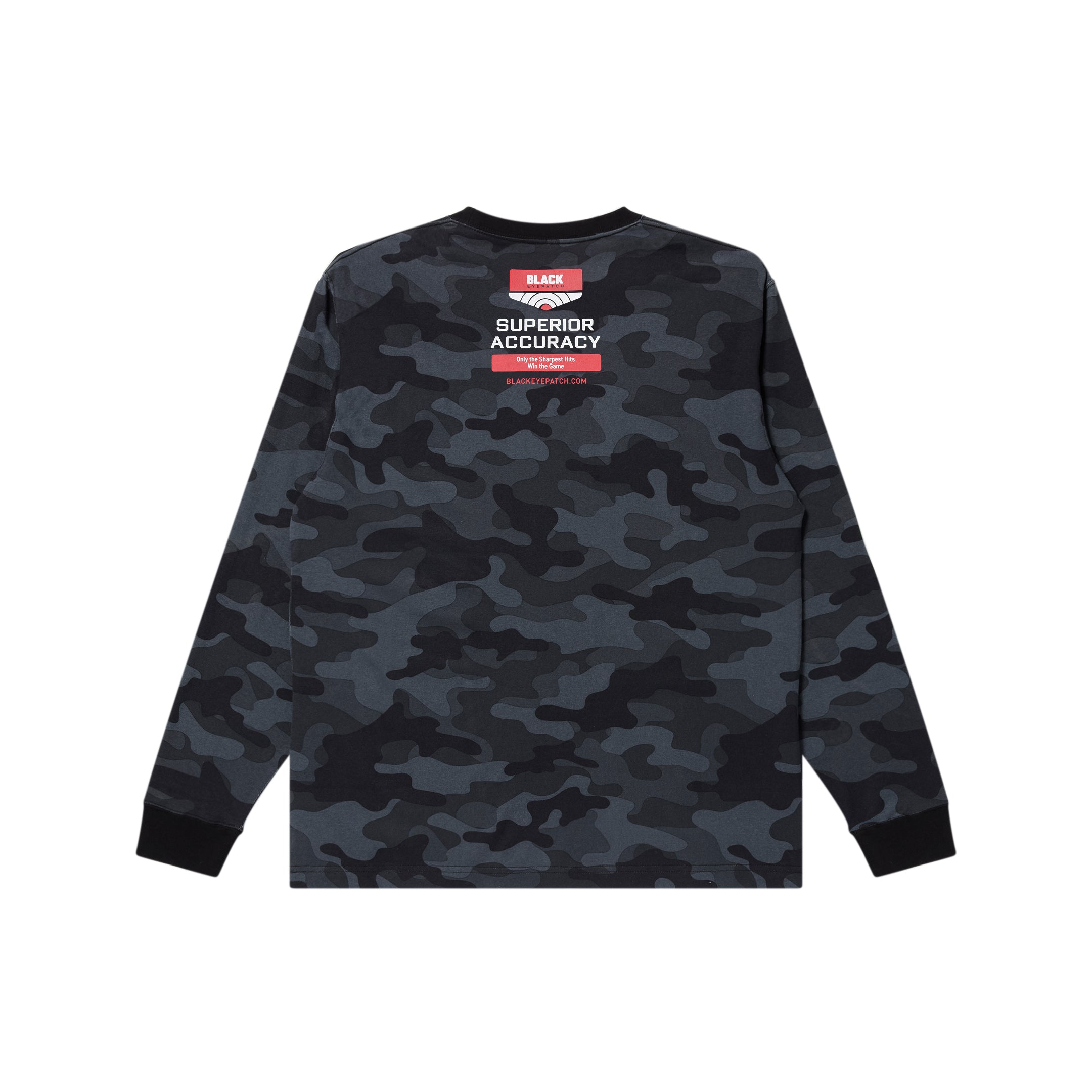 A 8.5oz long-sleeve t-shirt featuring a large brand logo spanning from the body to the sleeves and a target graphic printed on the front. The back graphic samples the logo of a US shooting equipment brand.
