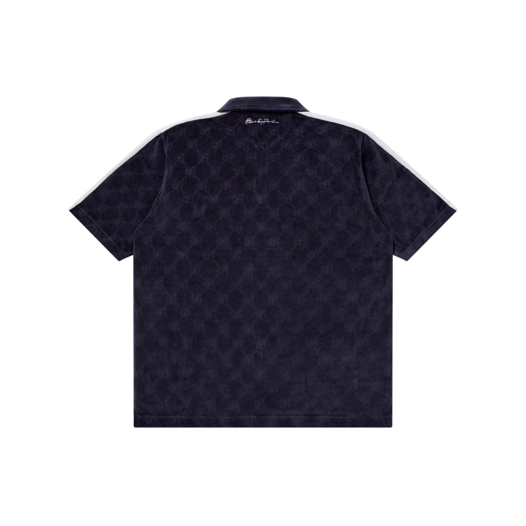 A half-zip shirt made of velour fabric featuring an all-over "B EMBLEM" pattern.
