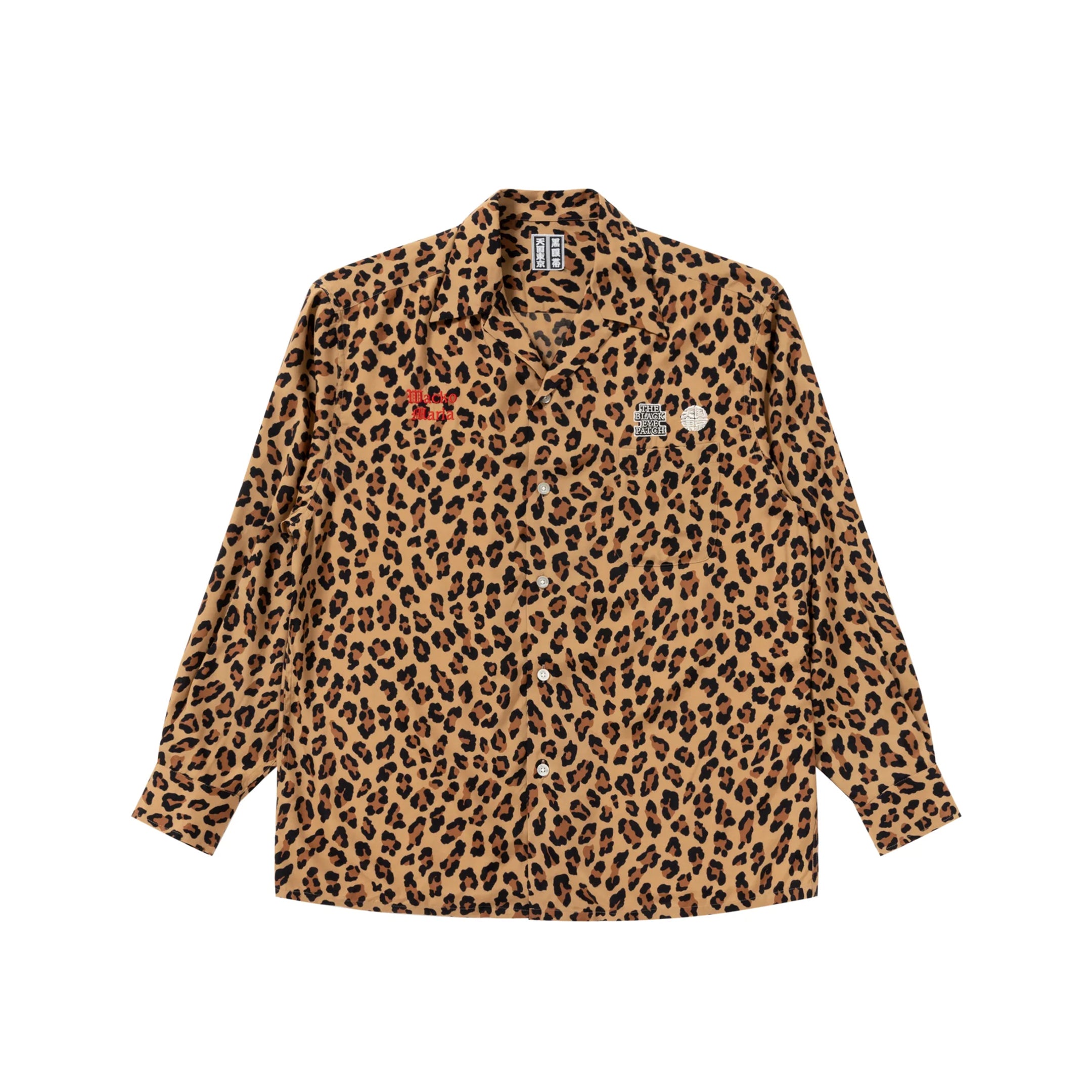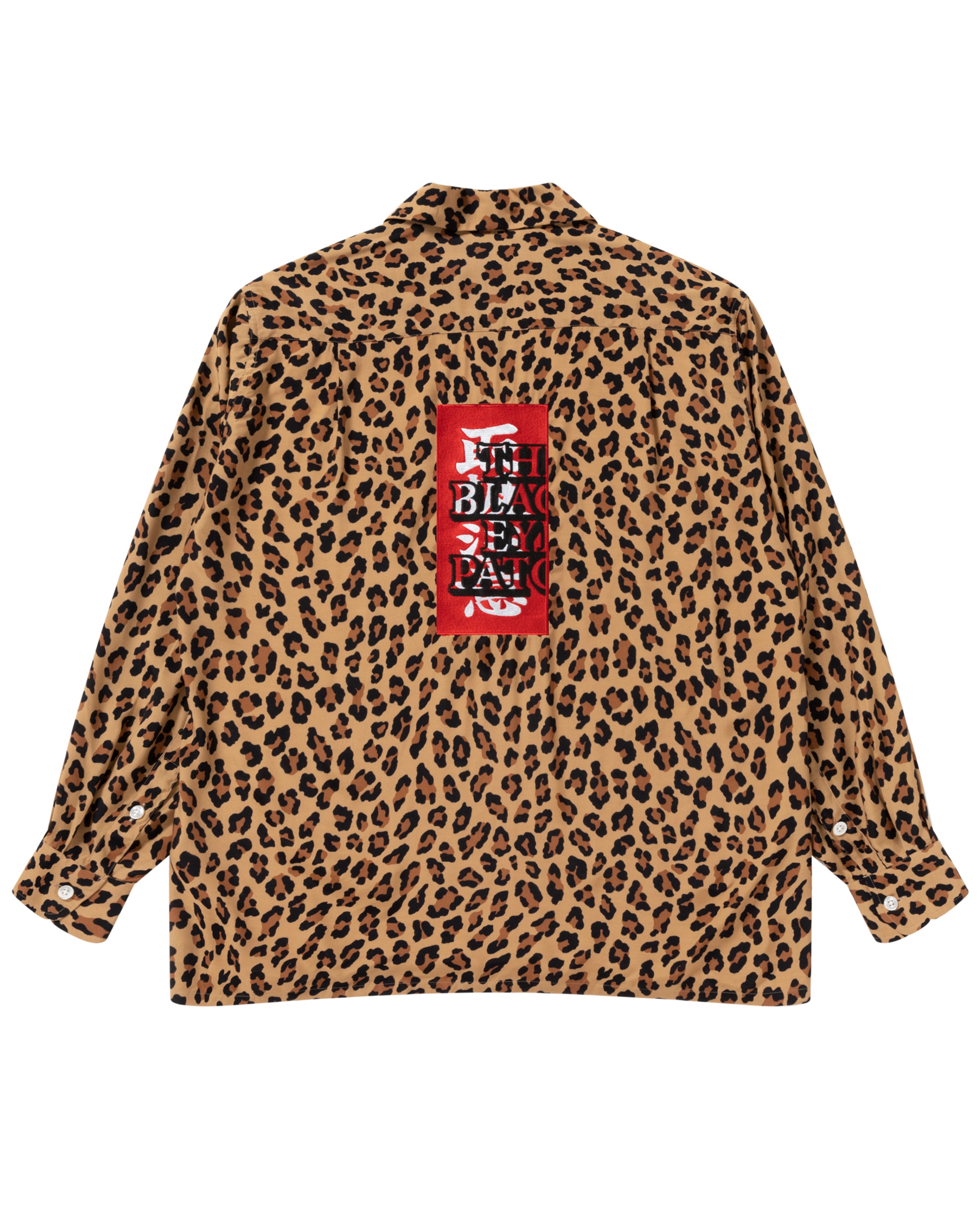 This is a WACKO MARIA staple 50's shirt in a leopard print, with both brand logos embroidered on the front and the "Caution" label design embroidered on the back.