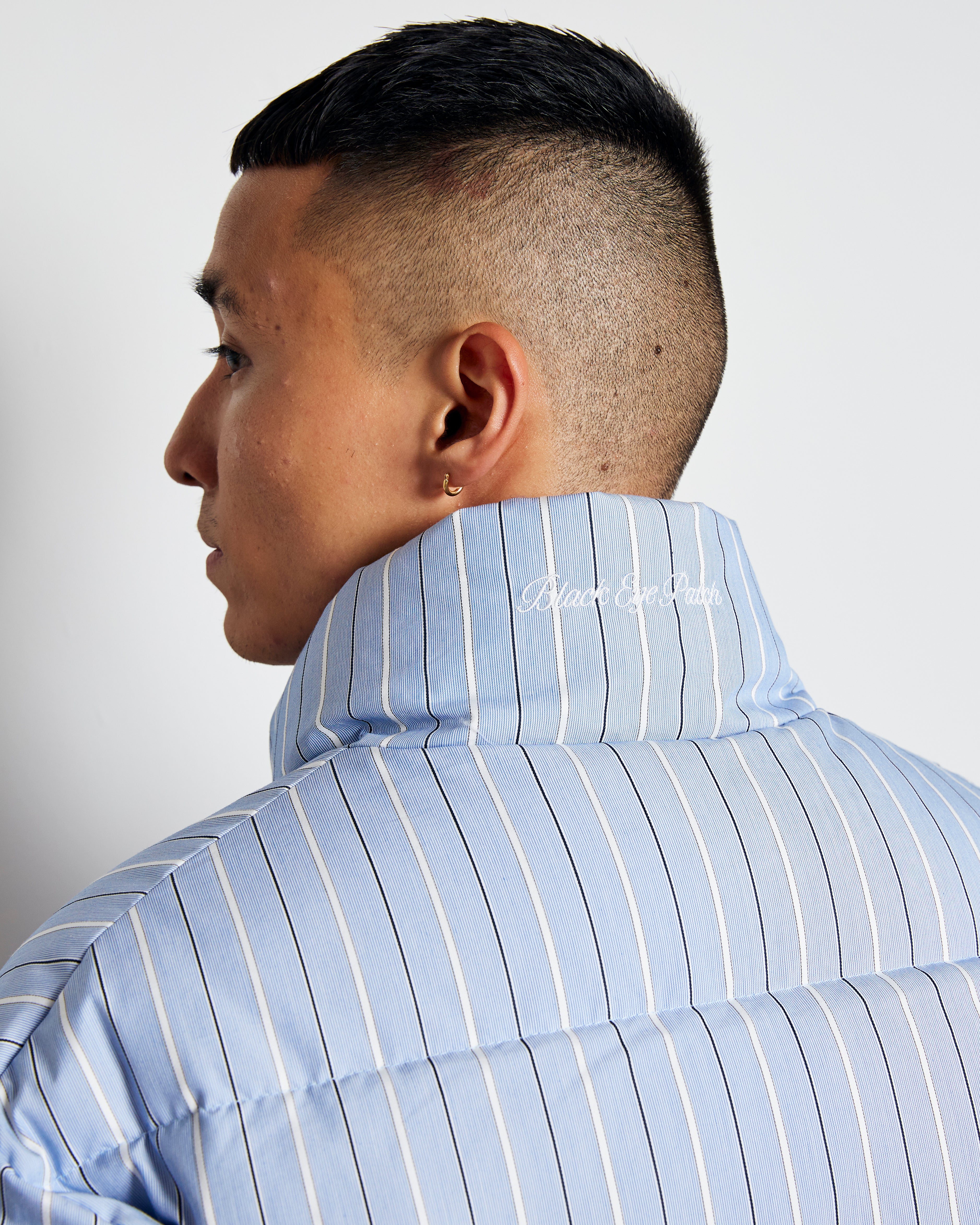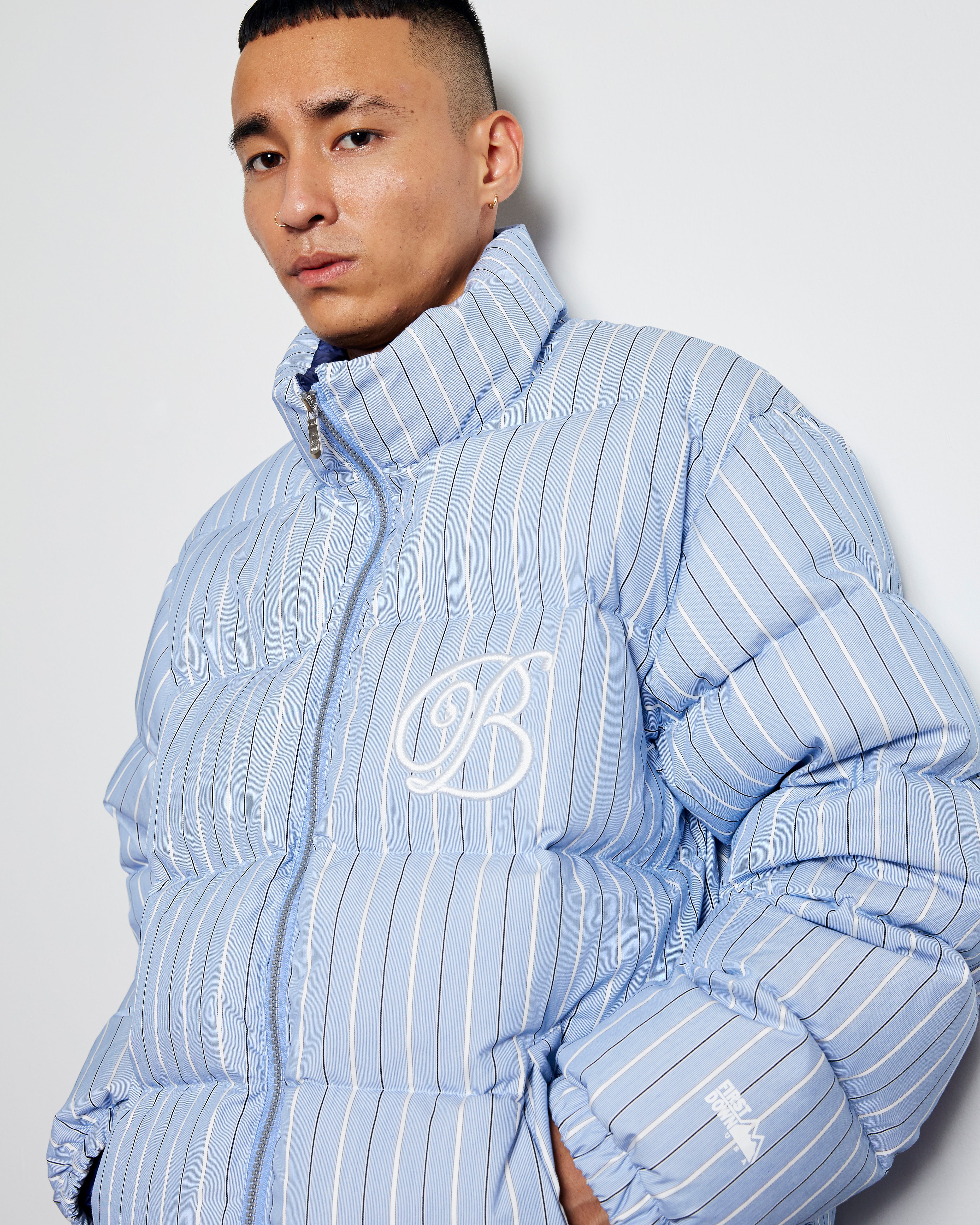 This down jacket features a premium "B" emblem logo embroidered on it and is made with a high-quality striped fabric.