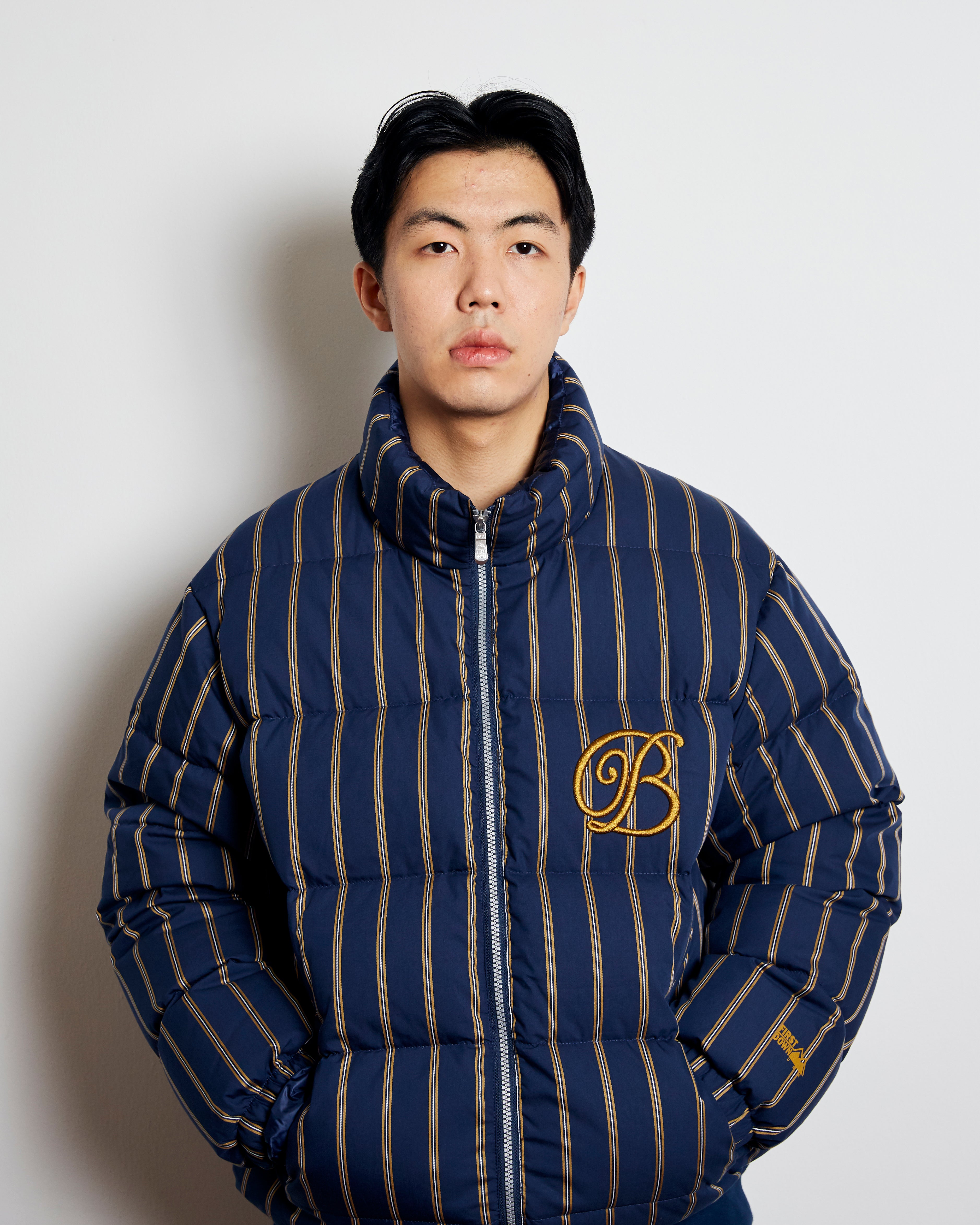 This down jacket features a premium "B" emblem logo embroidered on it and is made with a high-quality striped fabric.