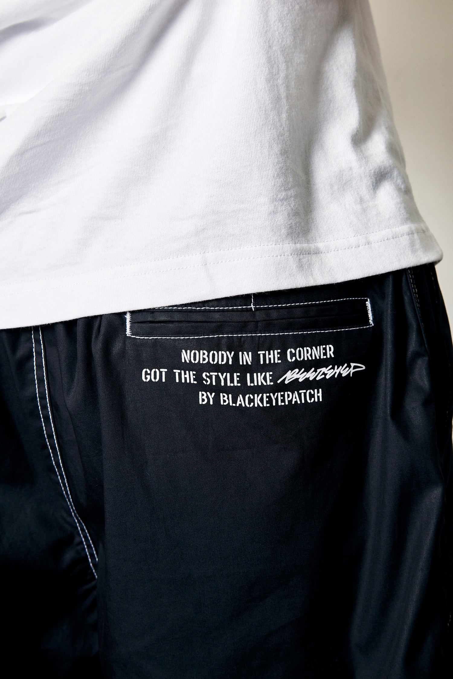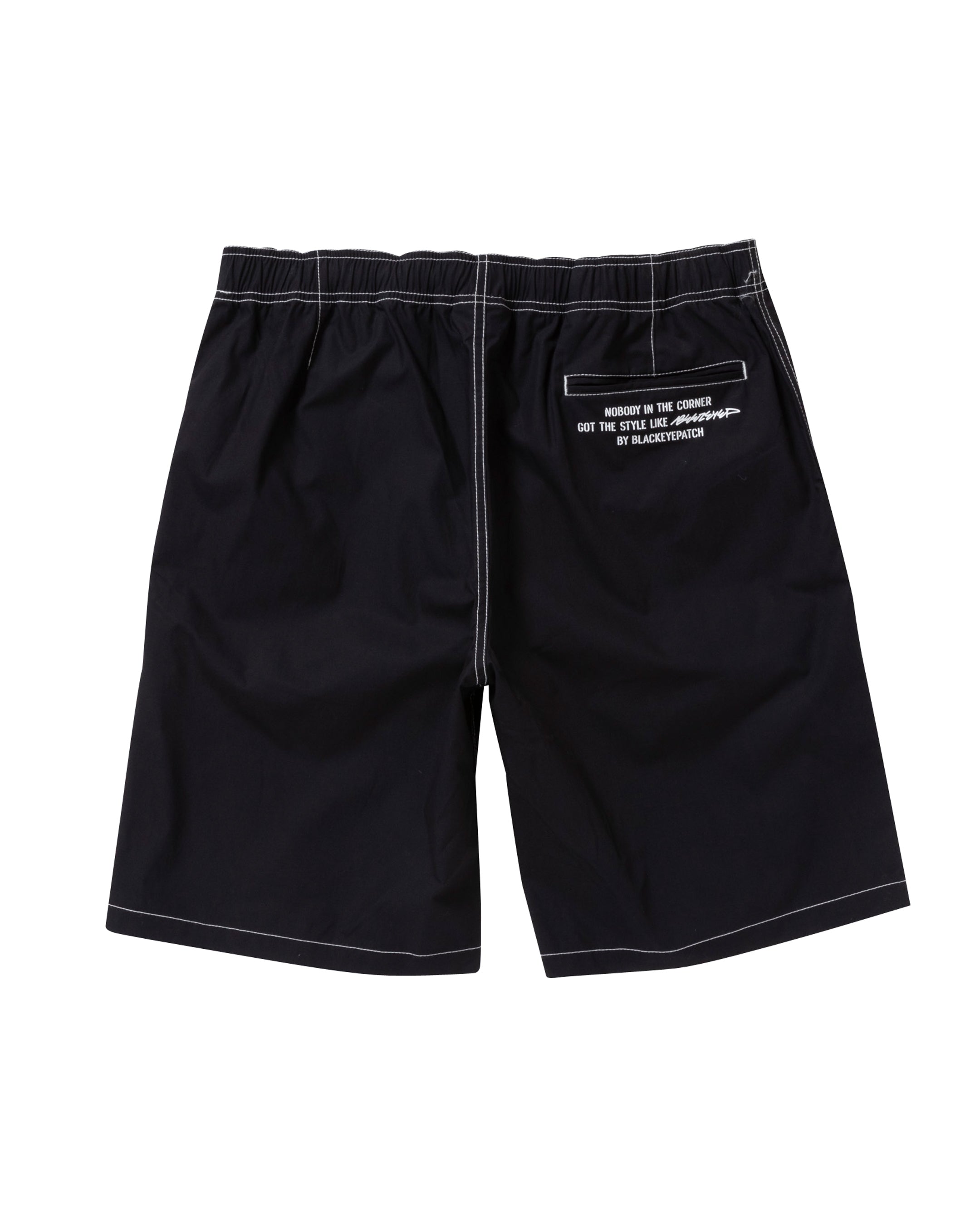These are easy- style shorts with a BEEZ-EYE-P graphic printed on the front , representing "BlackEyePatch . "