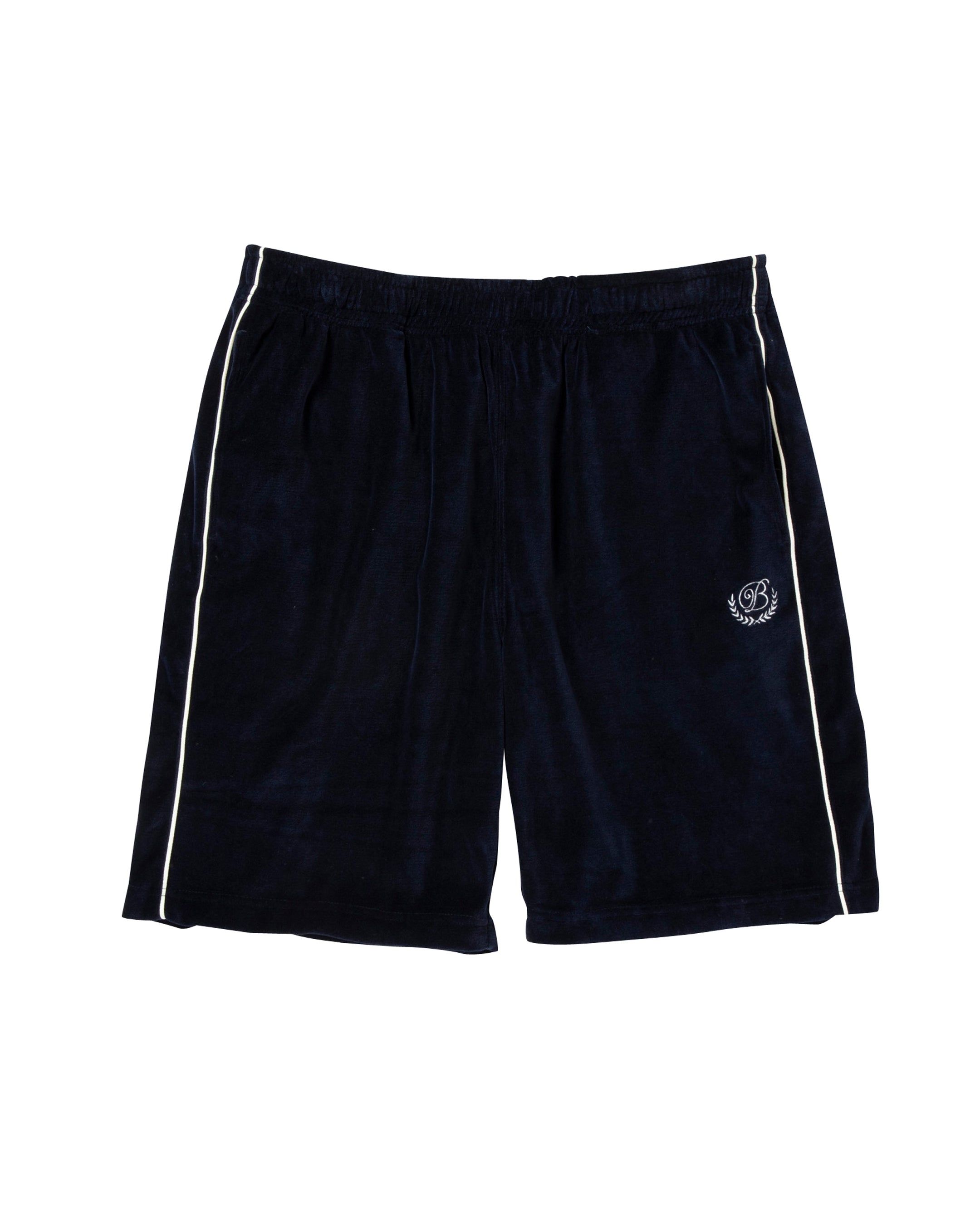 These are easy-style velour shorts with the "B" emblem logo embroidered in the same color on the front.