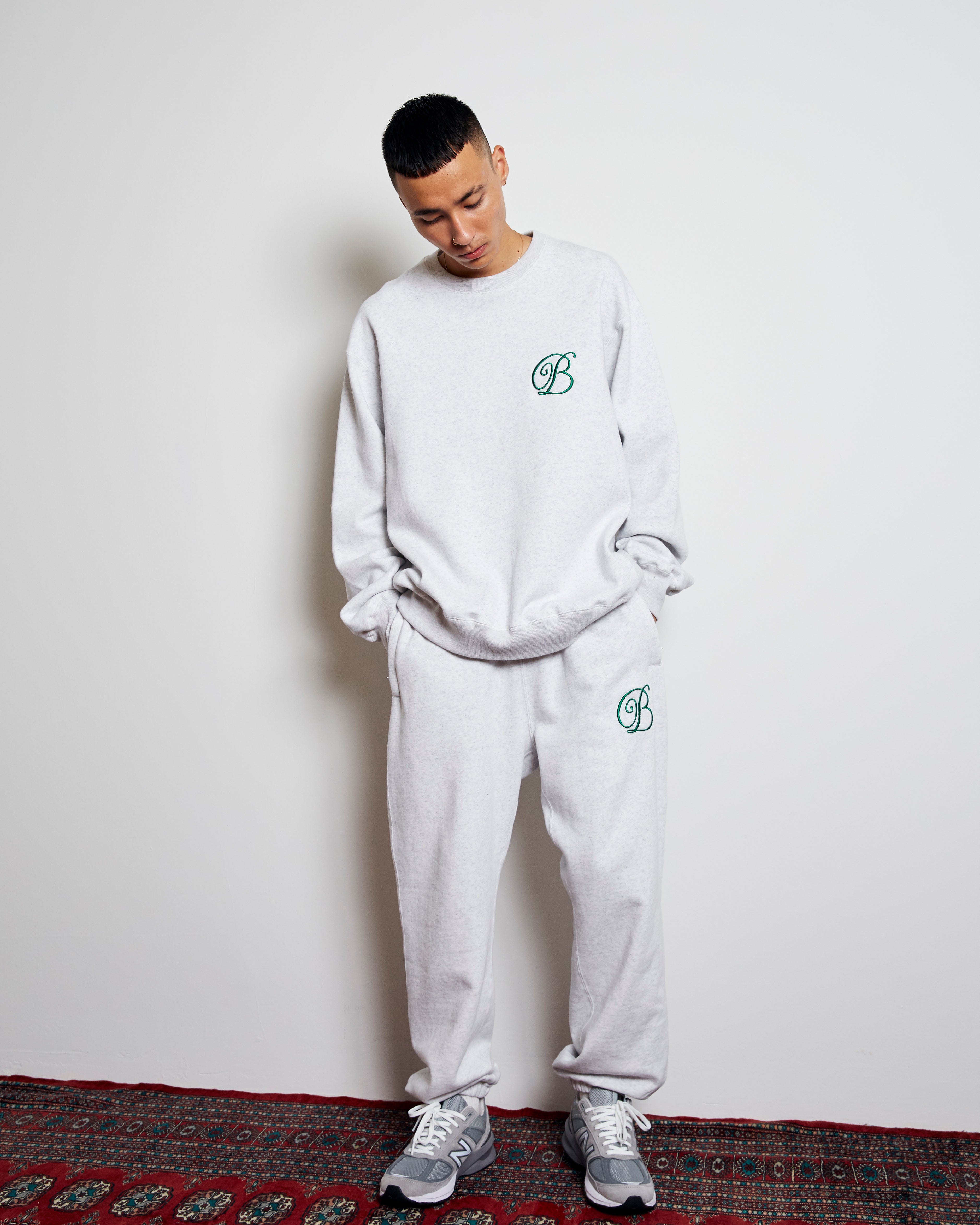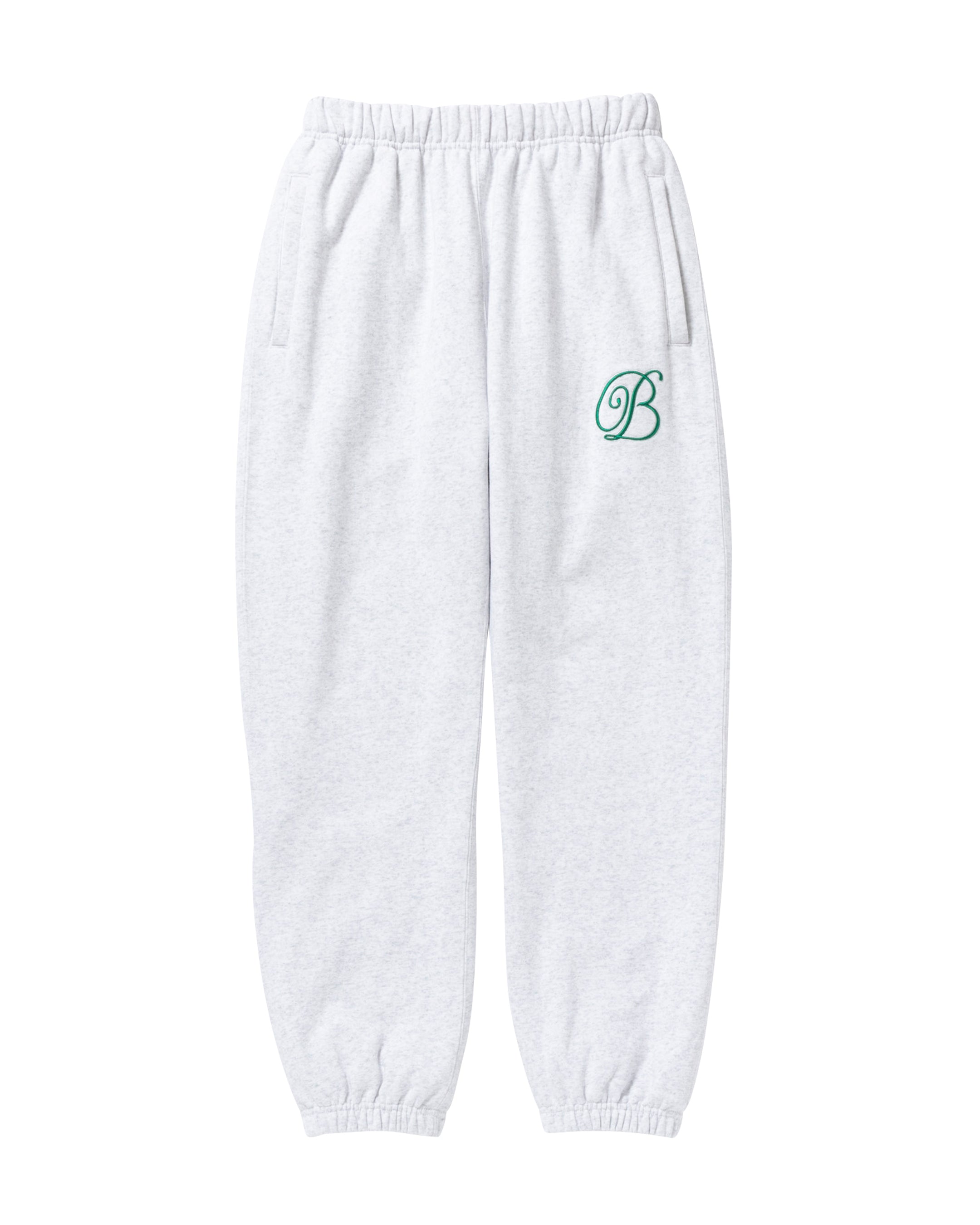 Front of These sweat pants feature an embroidered "B" emblem logo on the left thigh .