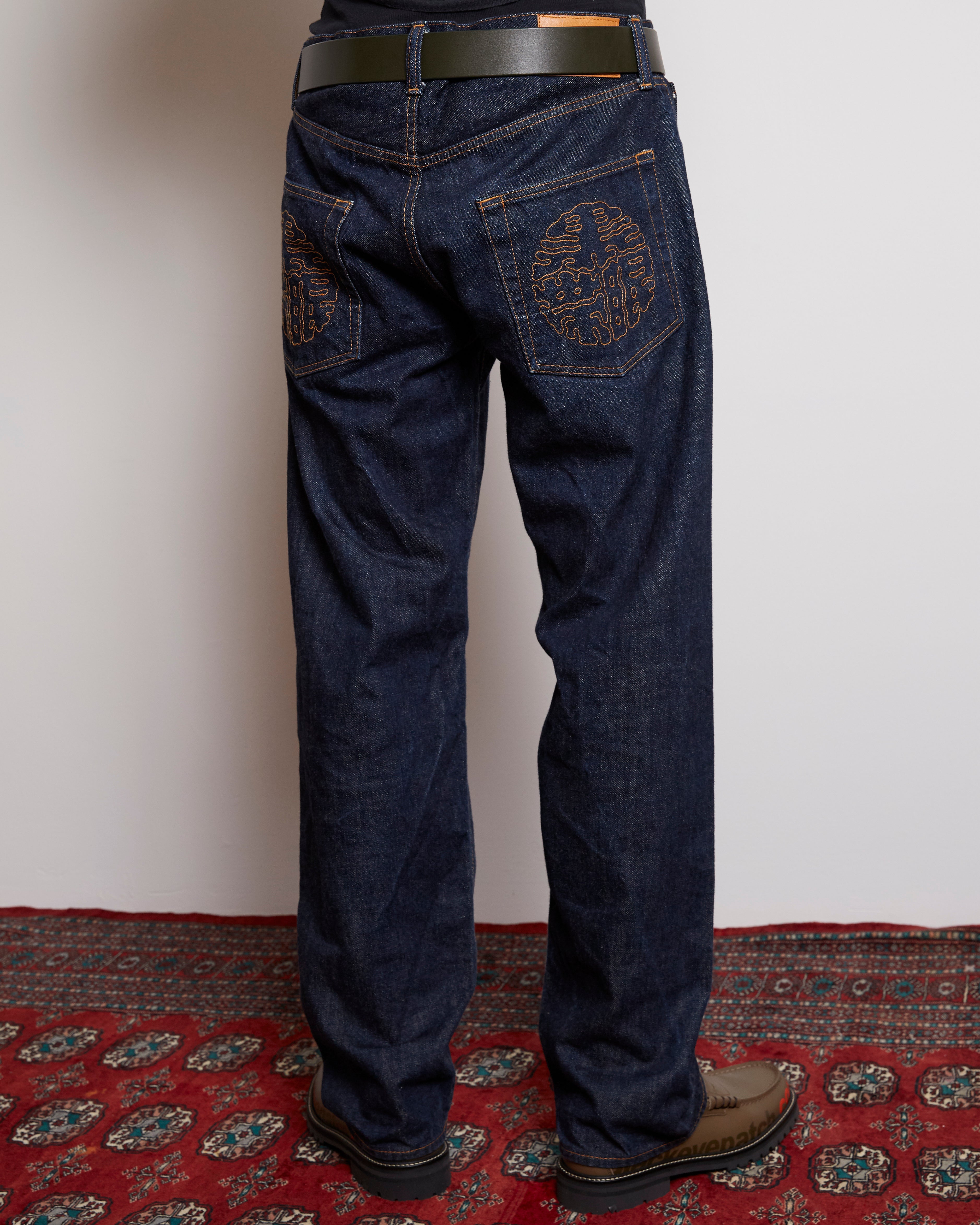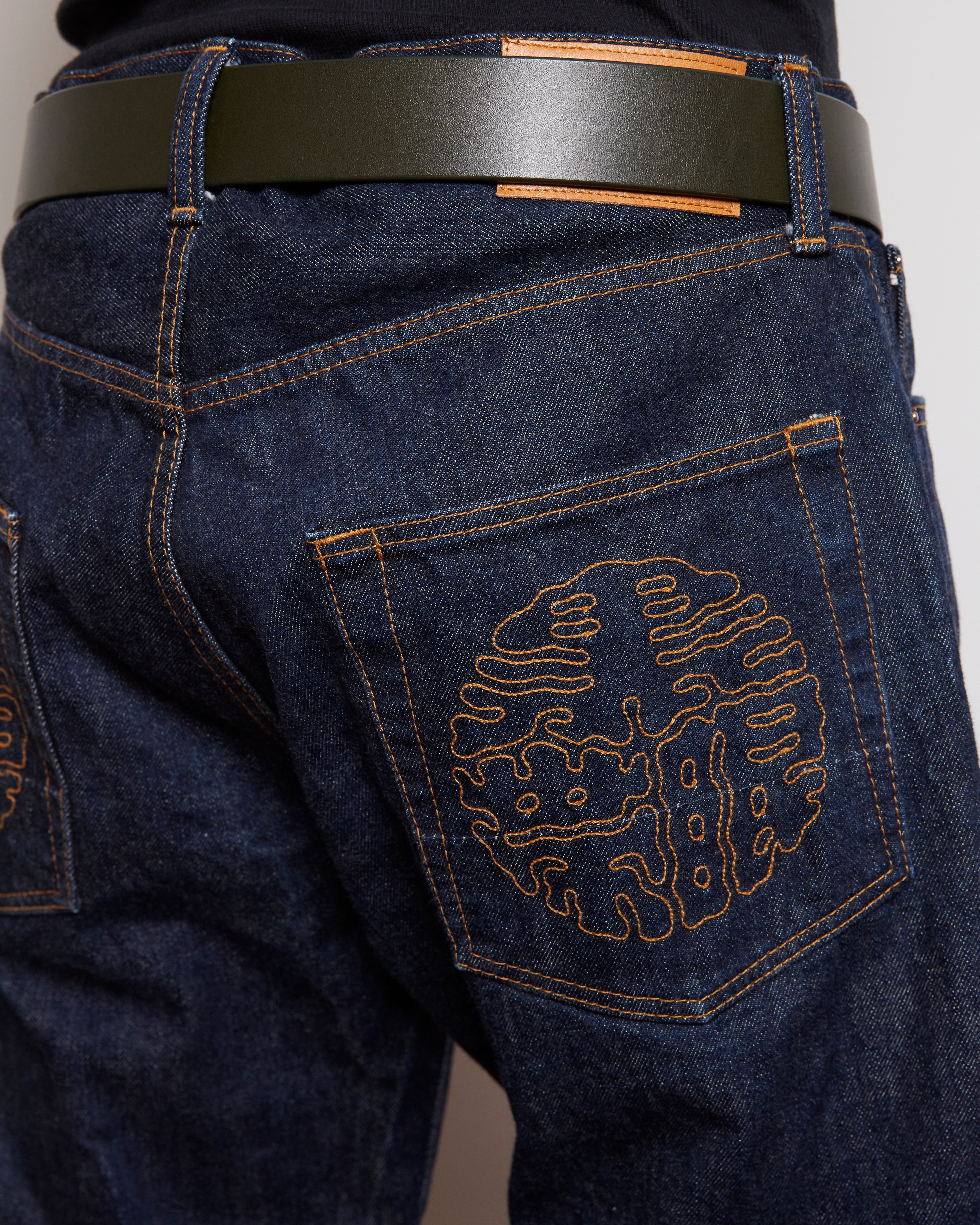 These 15.3oz selvedge jeans feature embroidery of the "black eye patch" character, designed by Ukichiyo Tachibana, an Edo-style calligrapher who has worked on traditional projects such as Yushima Tenmangu Shrine, Senso-ji Temple in Shibamata, and Senbazan (shrine plaques), and is embroidered on the back pocket.
