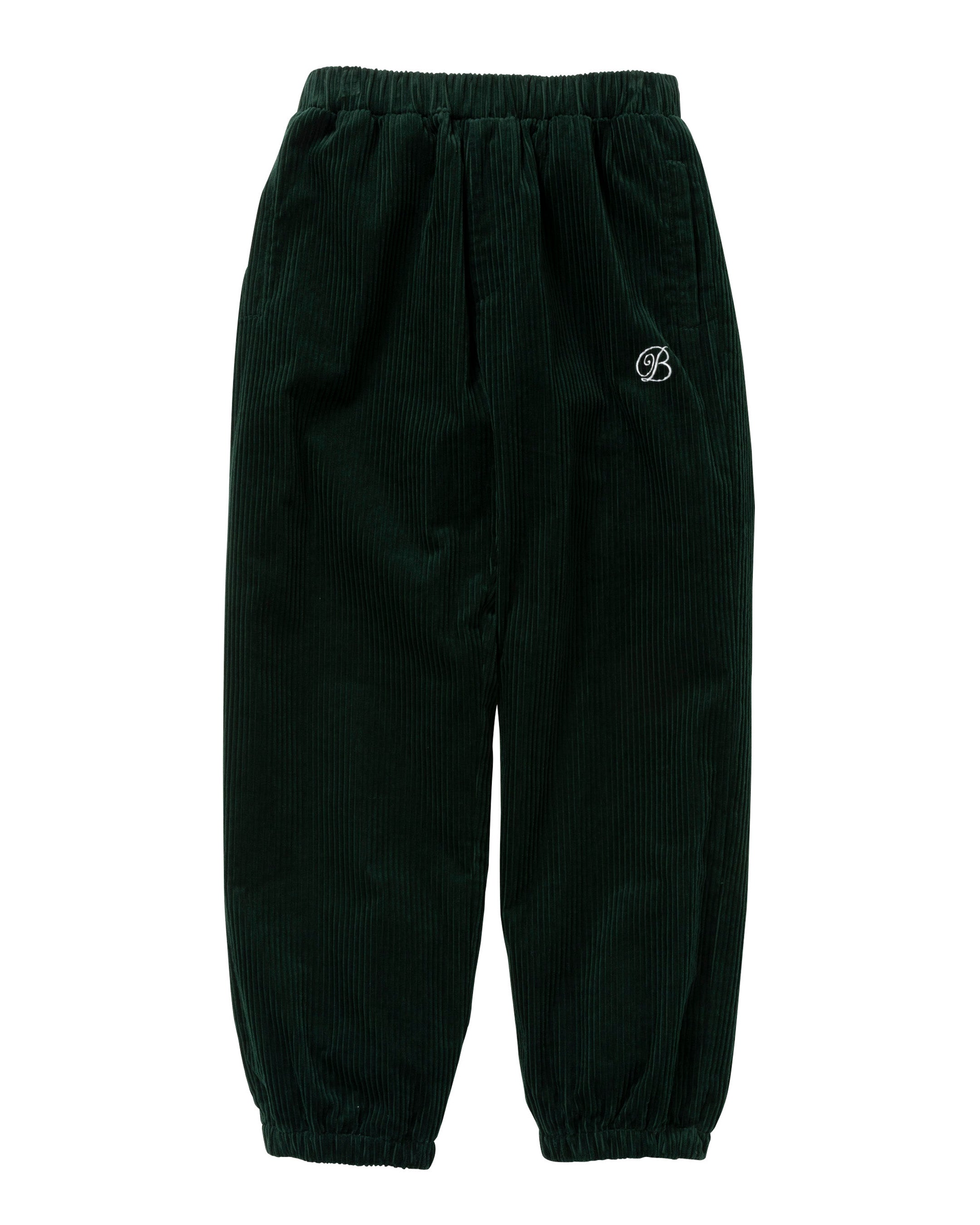 These track pants are made of thick corduroy fabric and feature an embroidered "B" emblem logo on the left thigh.
