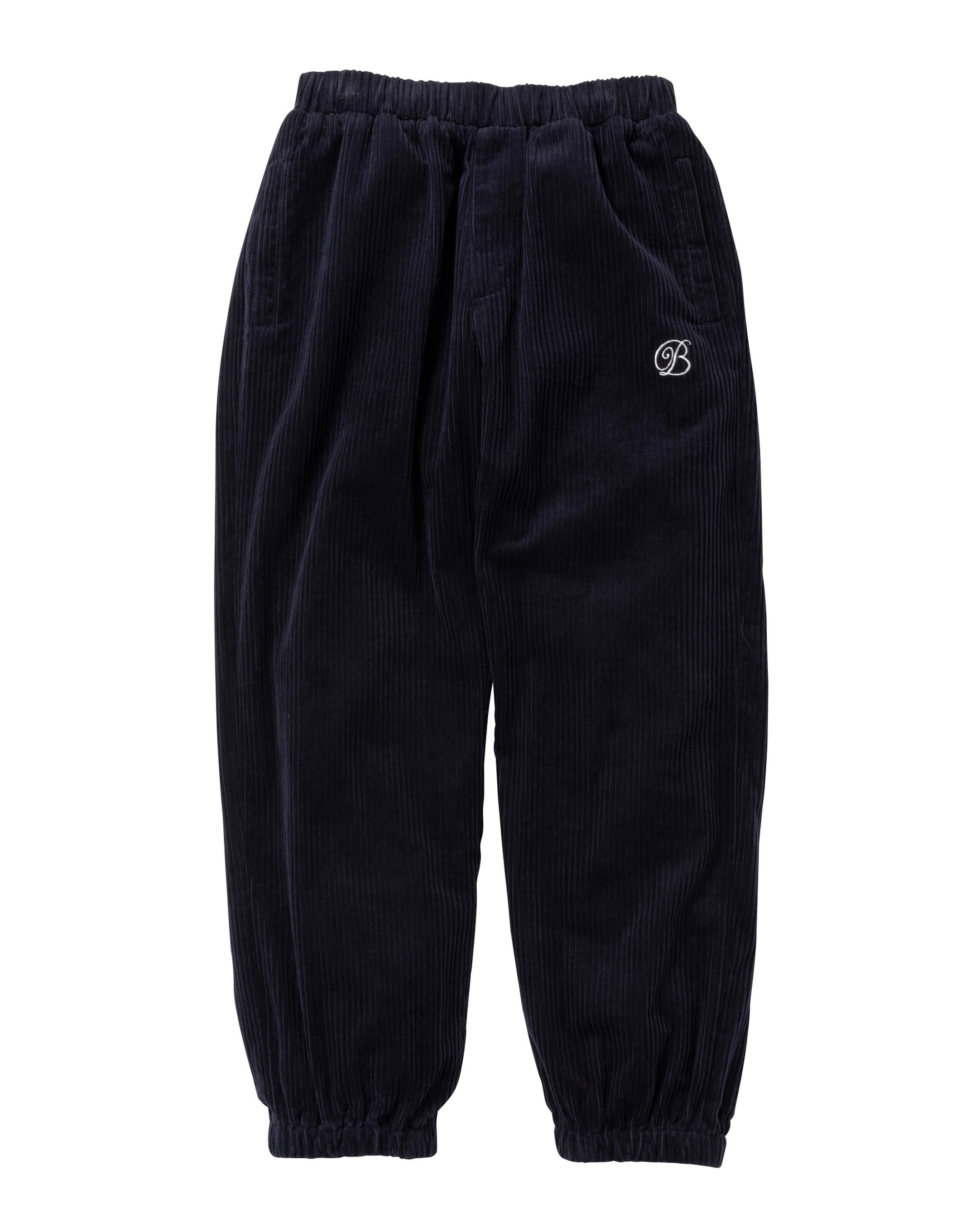 These track pants are made of thick corduroy fabric and feature an embroidered "B" emblem logo on the left thigh.