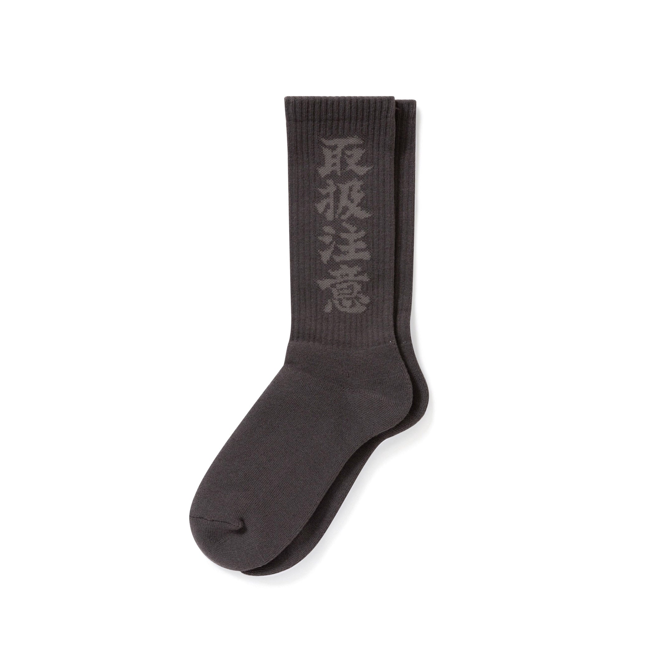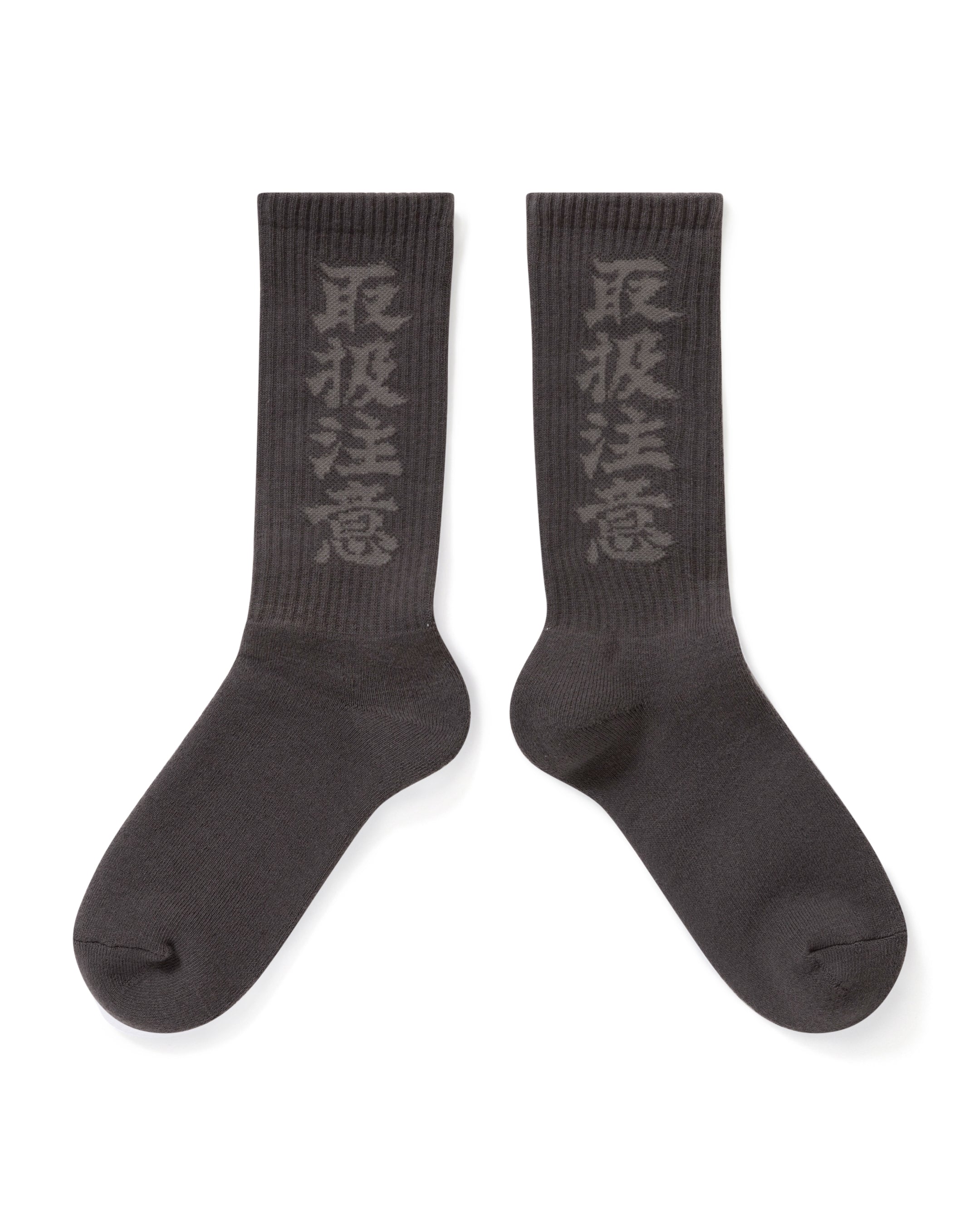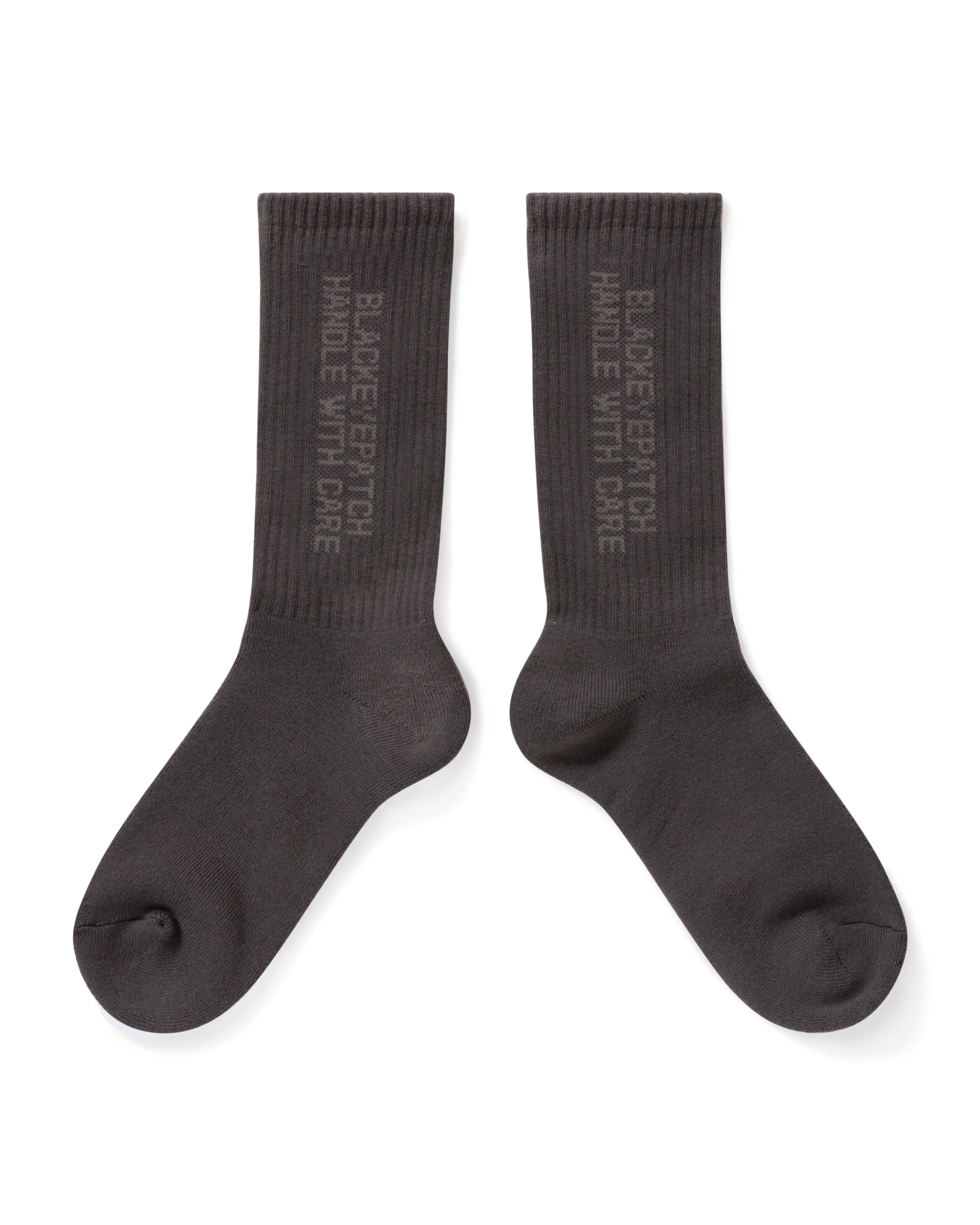 Rib-knit socks with a "Handle with Care" design woven into the fabric.
