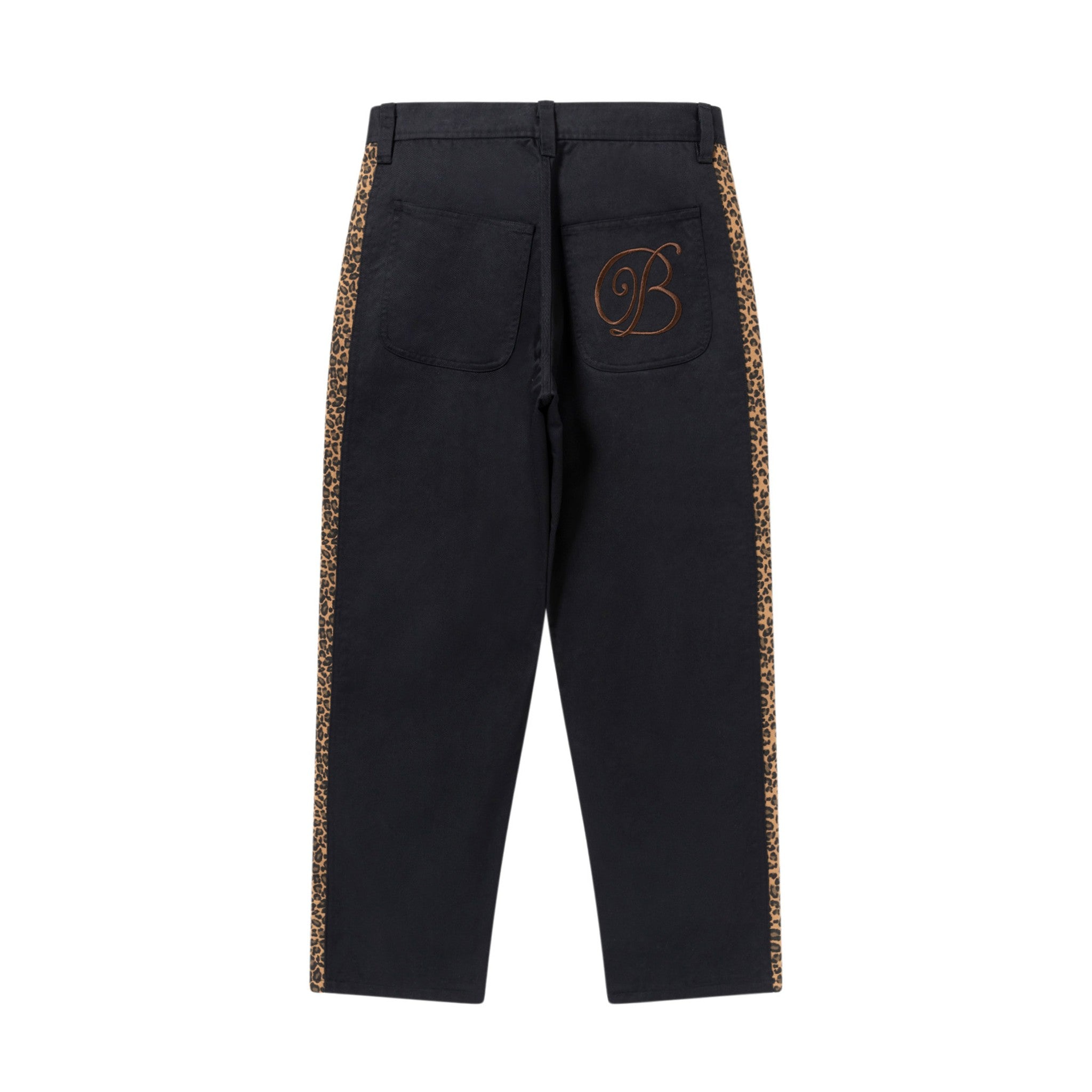 Work pants featuring a polyurethane embroidery of the "B EMBLEM" logo on the back pocket. Leopard print tape runs along the sides. Made from a polyester and cotton blend twill fabric. The matching shirt, designed in the same style, can be worn as a set.