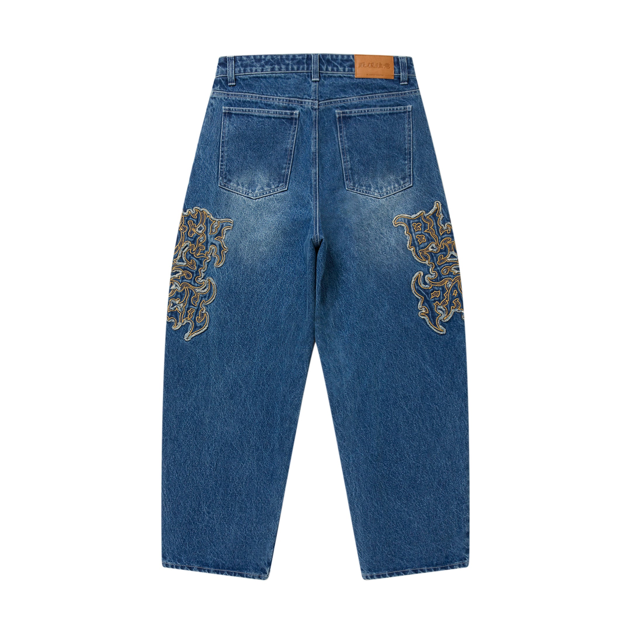 Extra baggy jeans made from 13.5 oz denim fabric. The brand name is rendered in a graphic style reminiscent of death metal bands, with an appliqué of matching denim fabric applied to the garment. The graphics were created by Chris M Wilson, an American artist known for his work on the artwork of South Florida-born rapper Denzel Curry. Available as a set with a matching jacket.