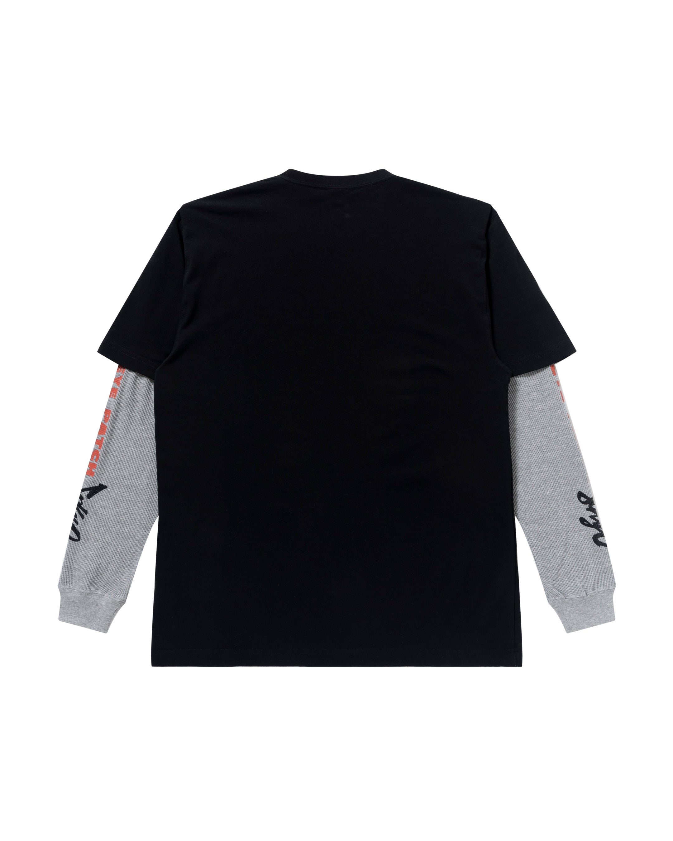 A long-sleeved T-shirt with a layered sleeve design featuring graphics inspired by 90's NY street brands.