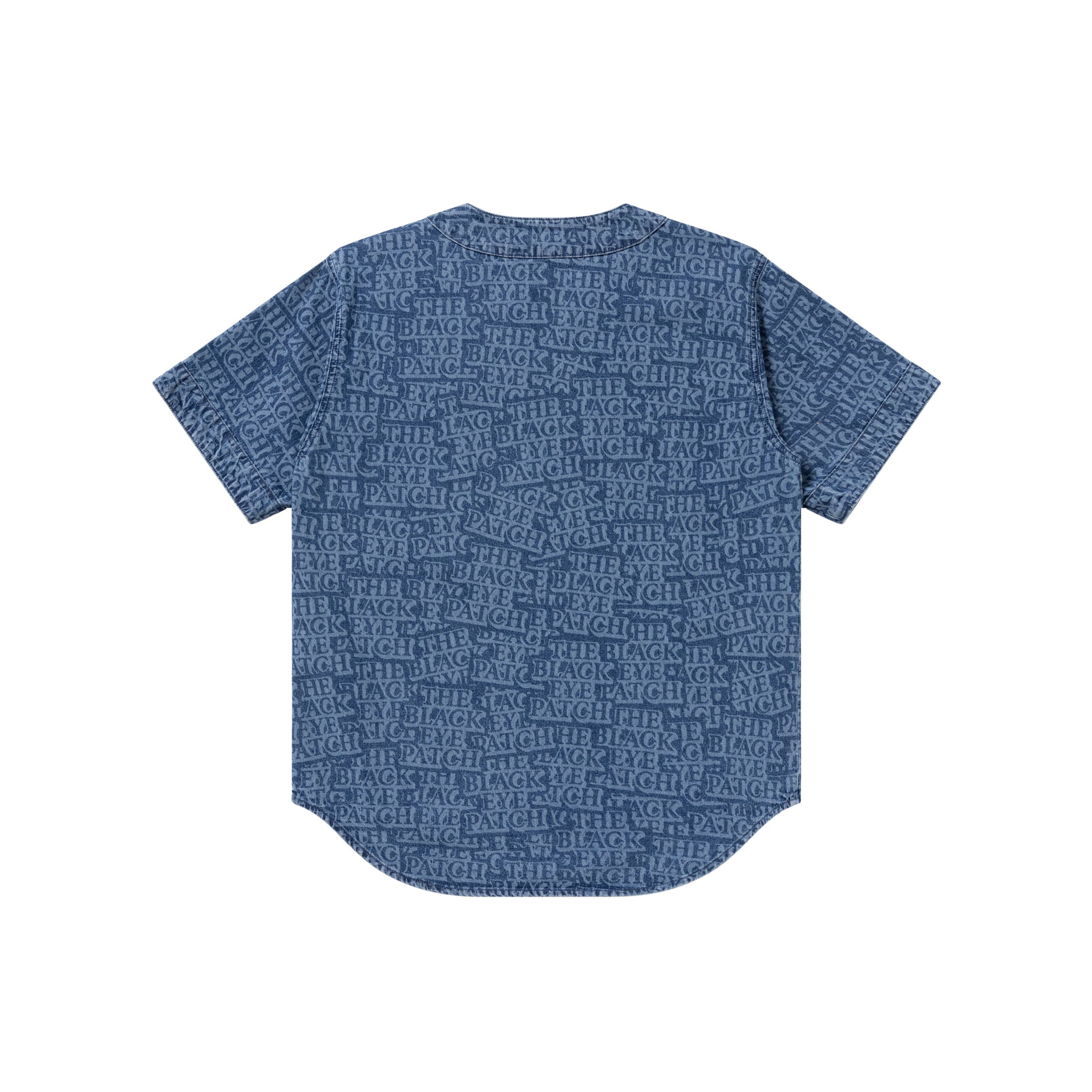 A baseball shirt made of denim fabric with an all-over "OG LABEL" logo pattern created using laser processing technology.