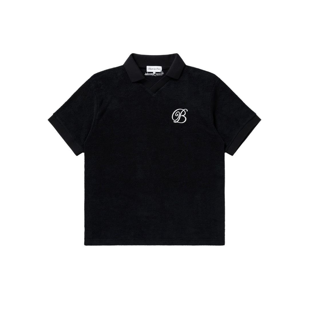 This is a V-neck polo shirt made of pile fabric with a "B" emblem on the chest and embroidered brand logo on the back of the neck.