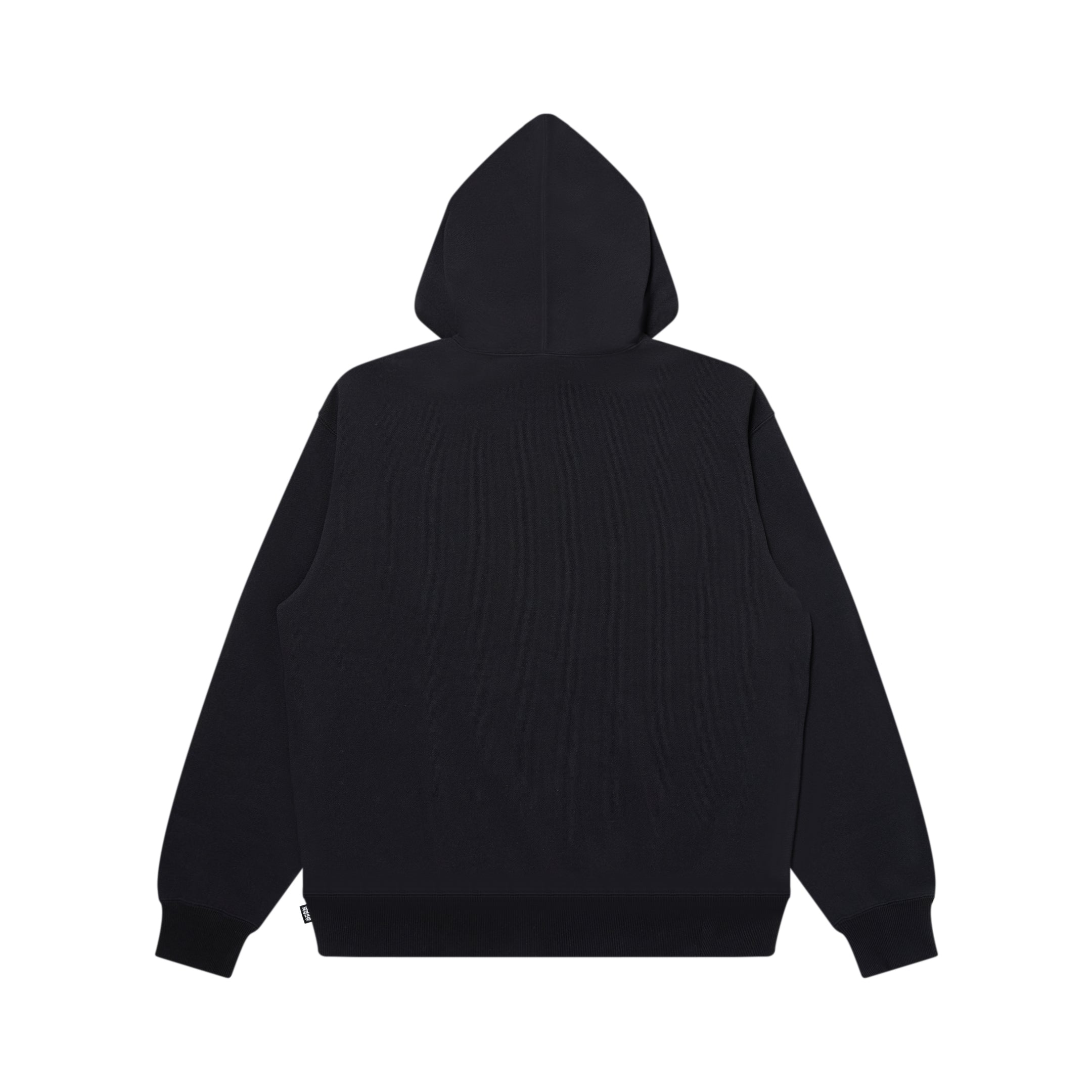 "取扱注意" LABEL のグラフィックをボディと同系色で表現し刺繍で施したプルオーバーフーディー。