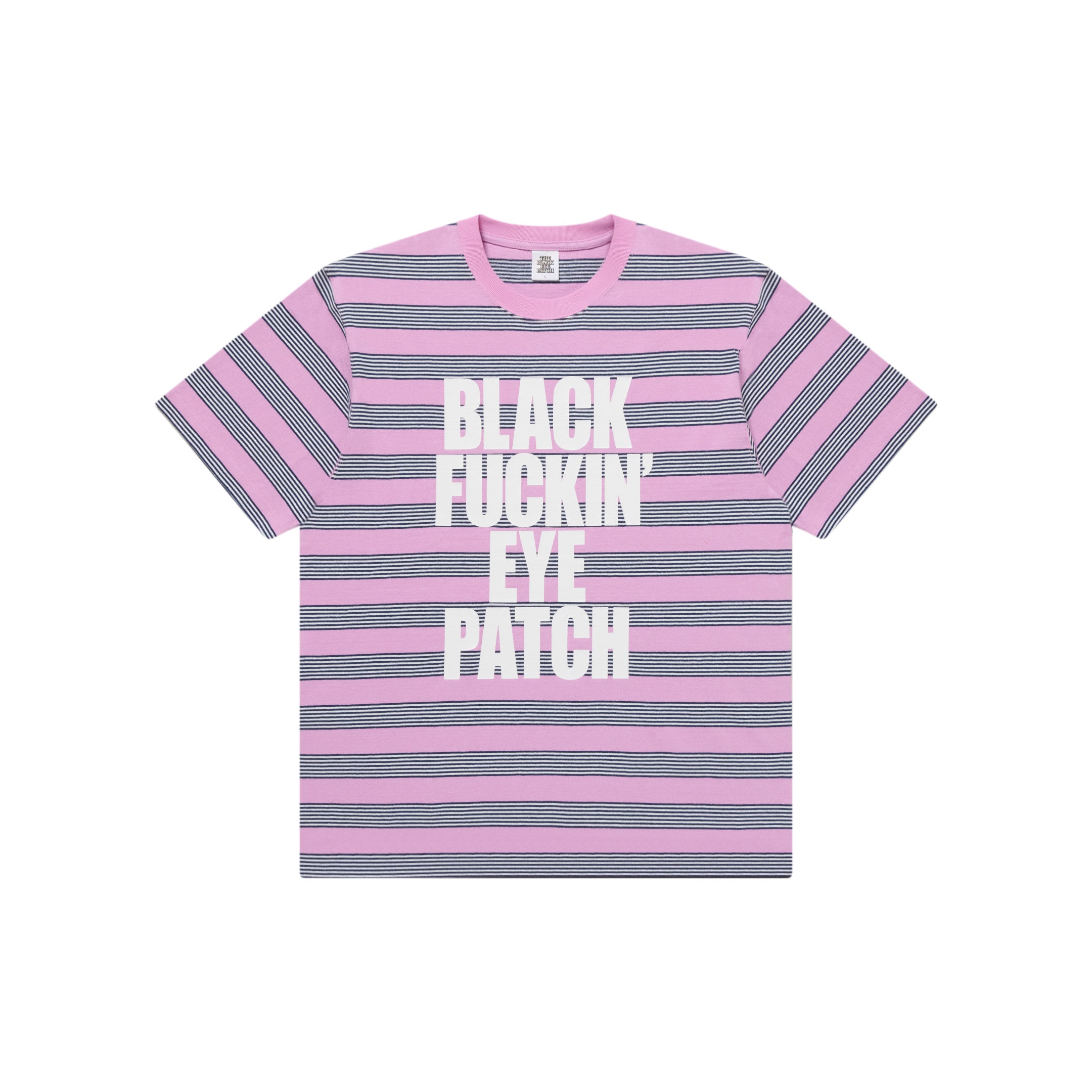 A 8.5oz t-shirt featuring a "BLACK FUCKIN’ EYE PATCH" graphic printed on a striped body.