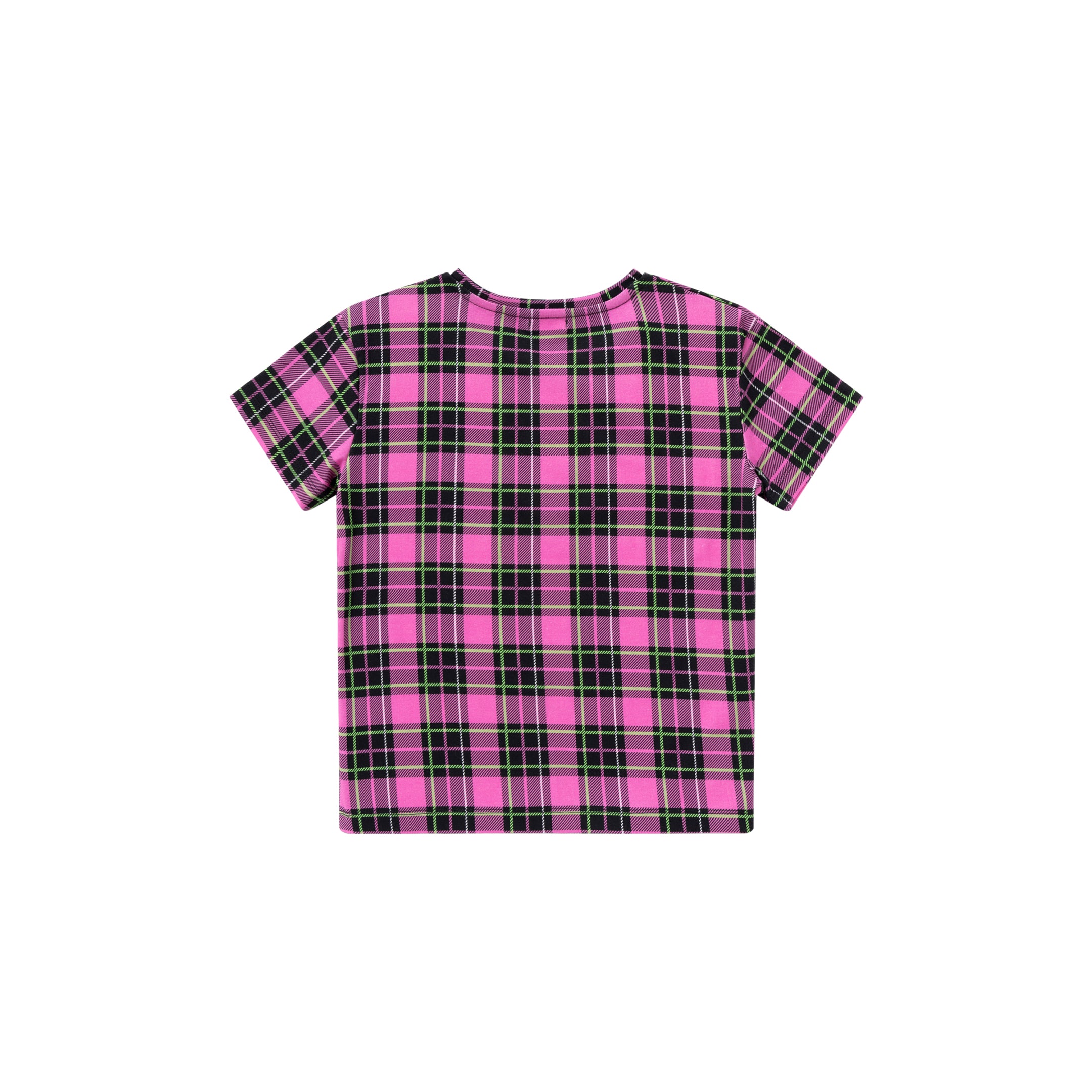 A T-shirt with "I♡RICH BOYS" printed on checkered fabric.