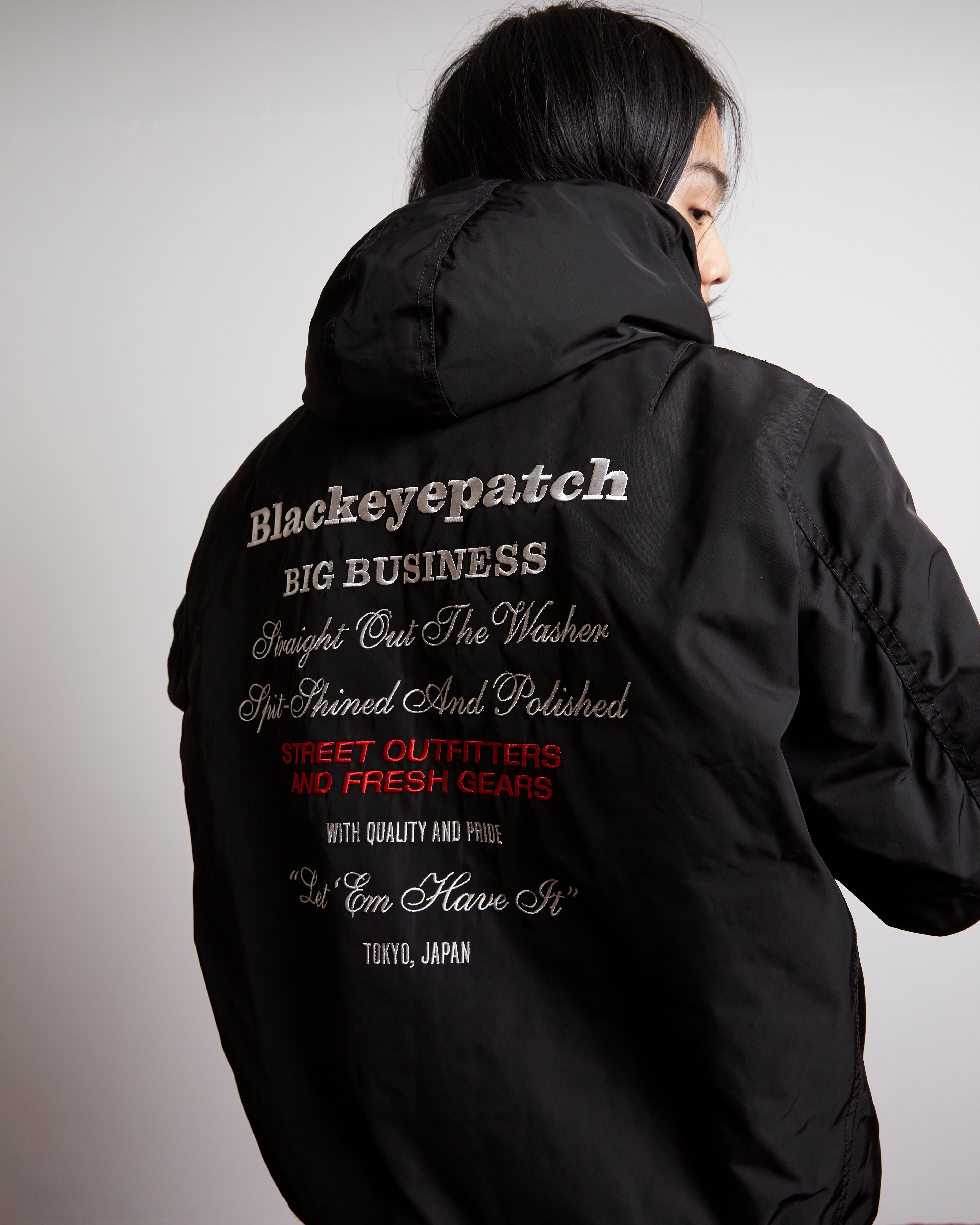 左胸にはブランドネームを、バックには大きくアーバンな雰囲気のタイポグラフィーの刺繍を施した HOODED BOMBER JACKET。