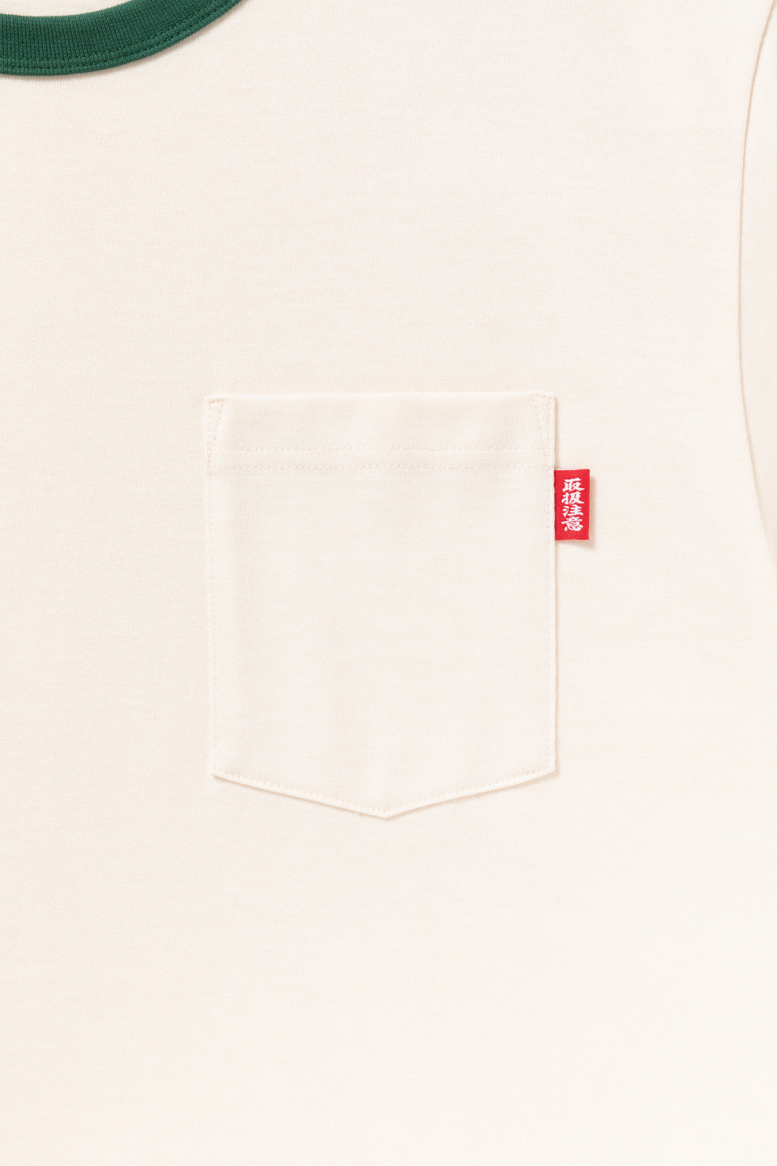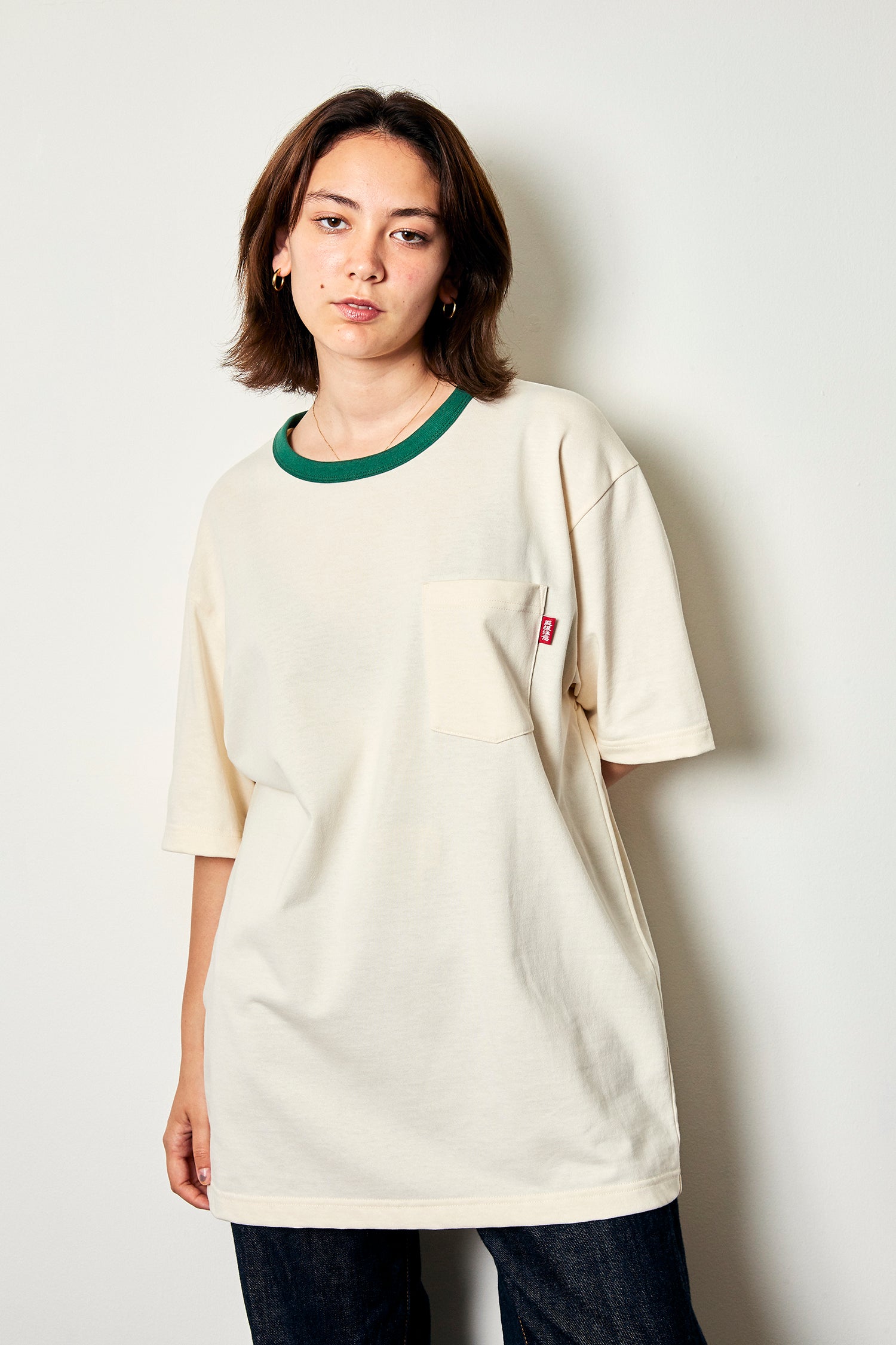 襟元のみカラーの異なる、リンガー仕様になったPOCKET TEE。ポケット部分には”取扱注意”のピスネーム付き。ボディーは9oz。