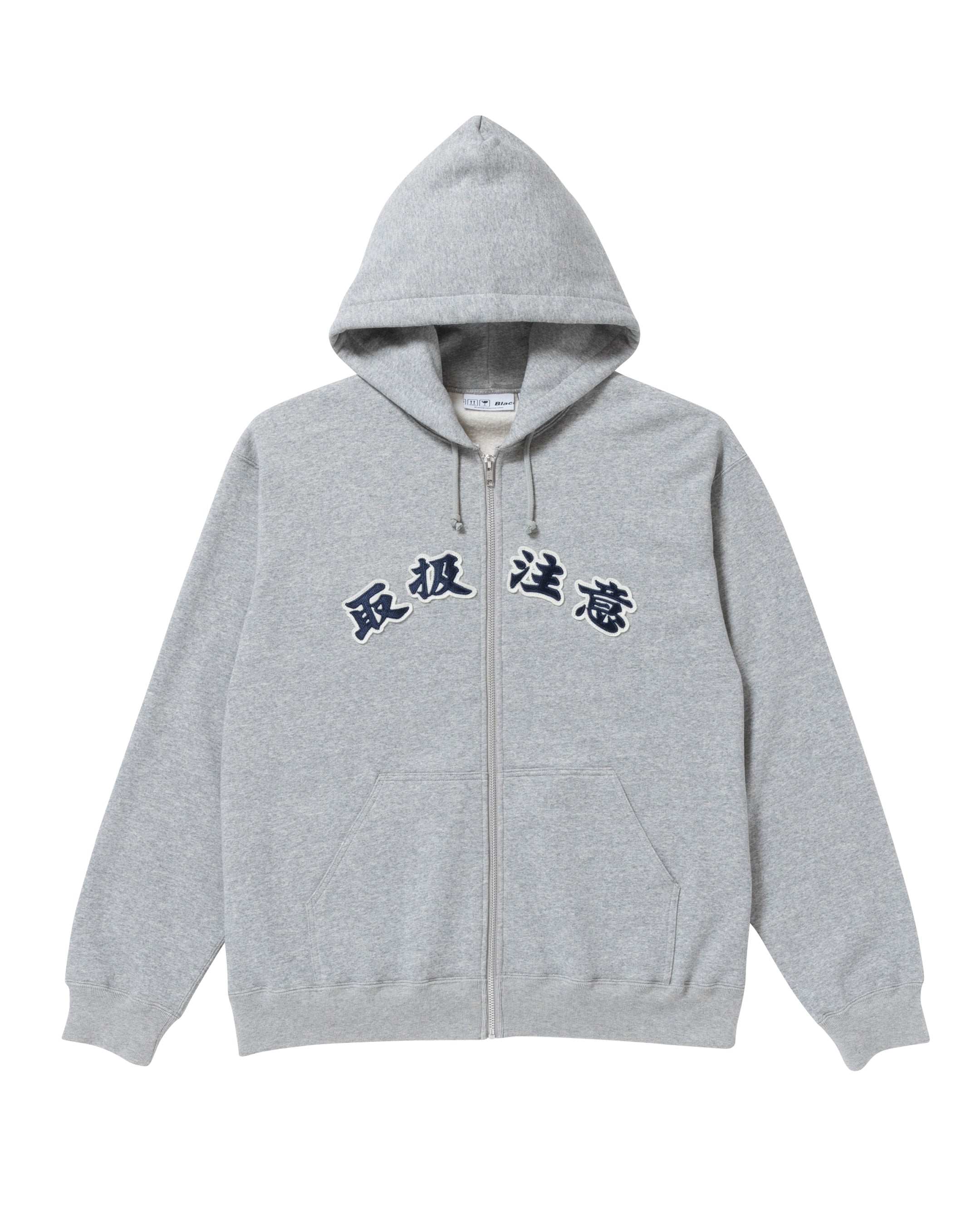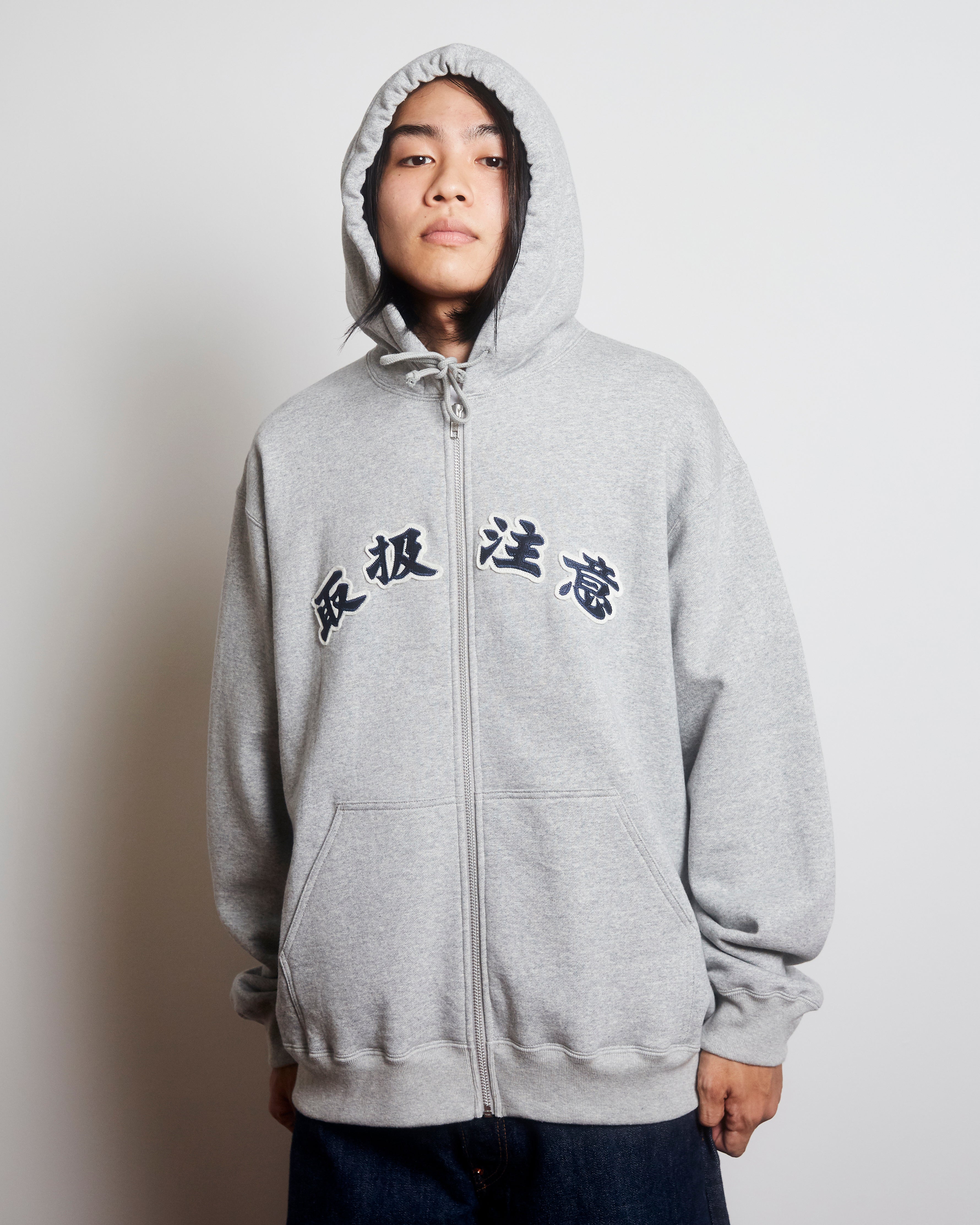 90’感漂う雰囲気で "取扱注意" の文字をワッペン仕様でフロントに載せた FULL ZIP タイプの HOODIE。