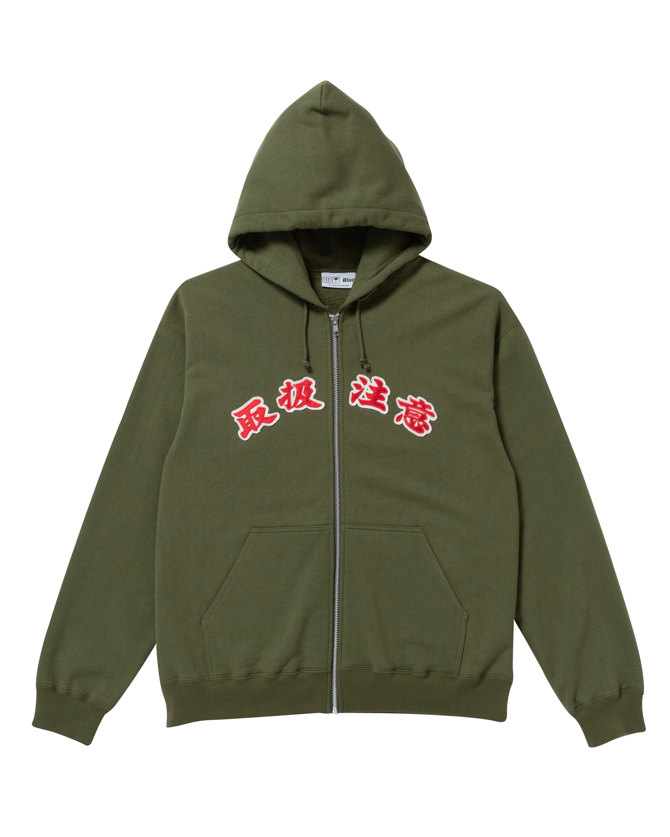 90’感漂う雰囲気で "取扱注意" の文字をワッペン仕様でフロントに載せた FULL ZIP タイプの HOODIE。