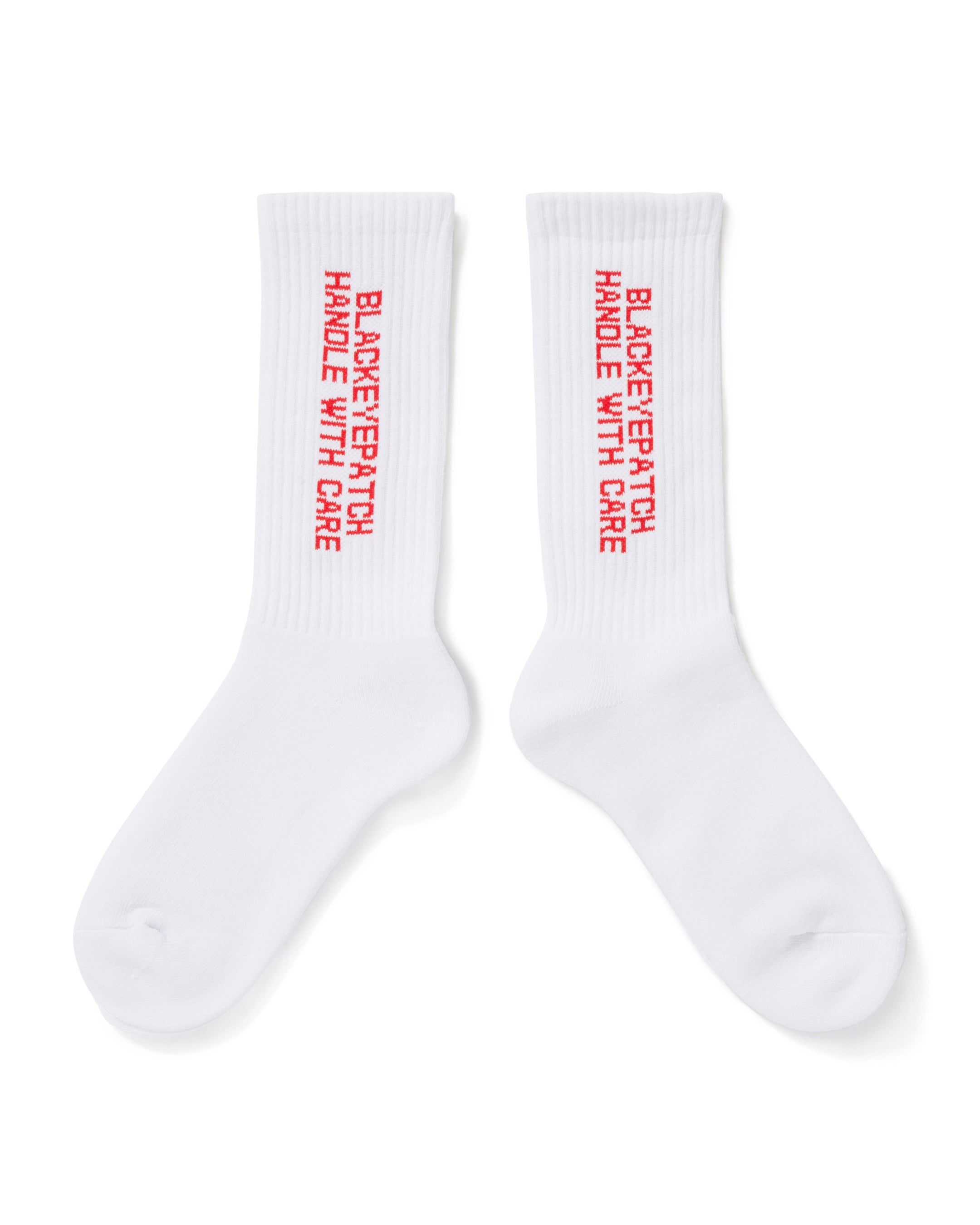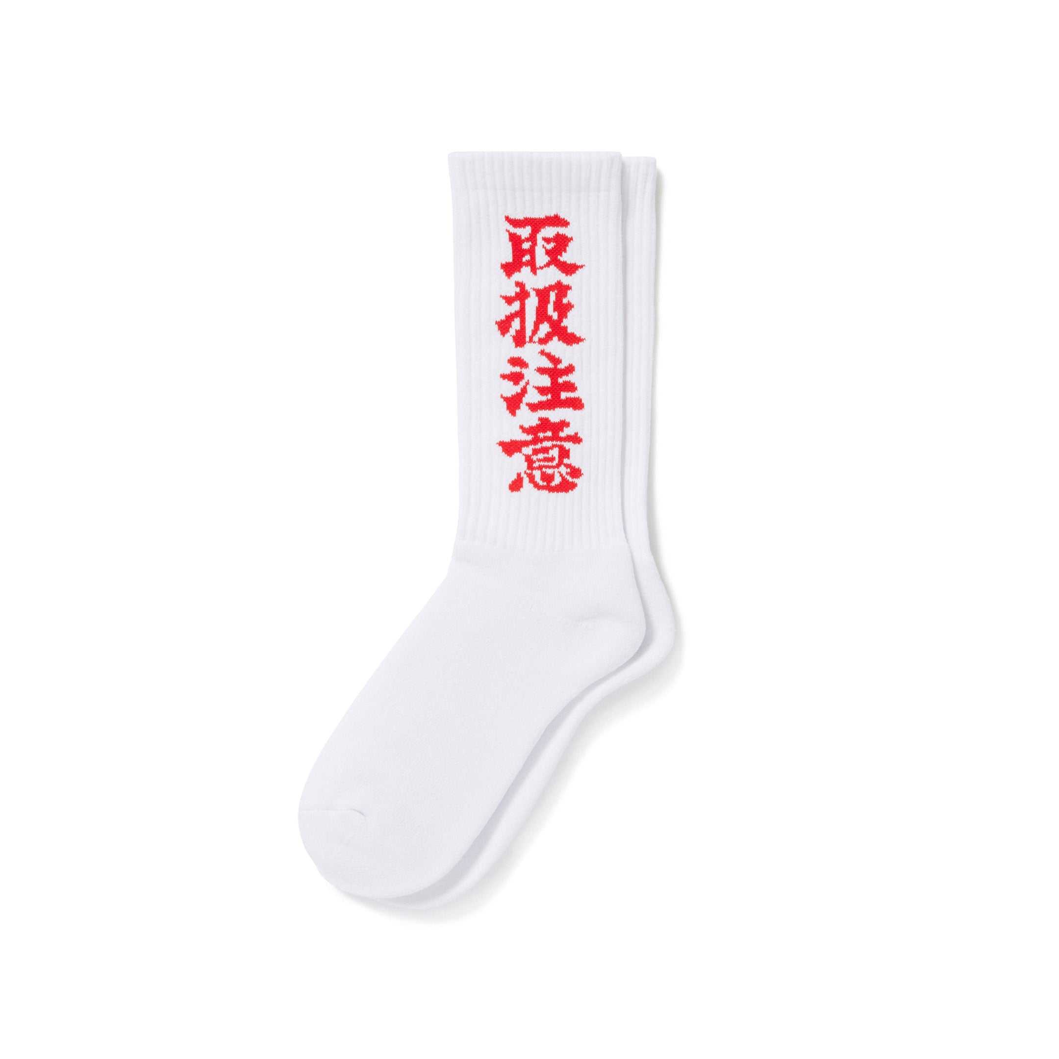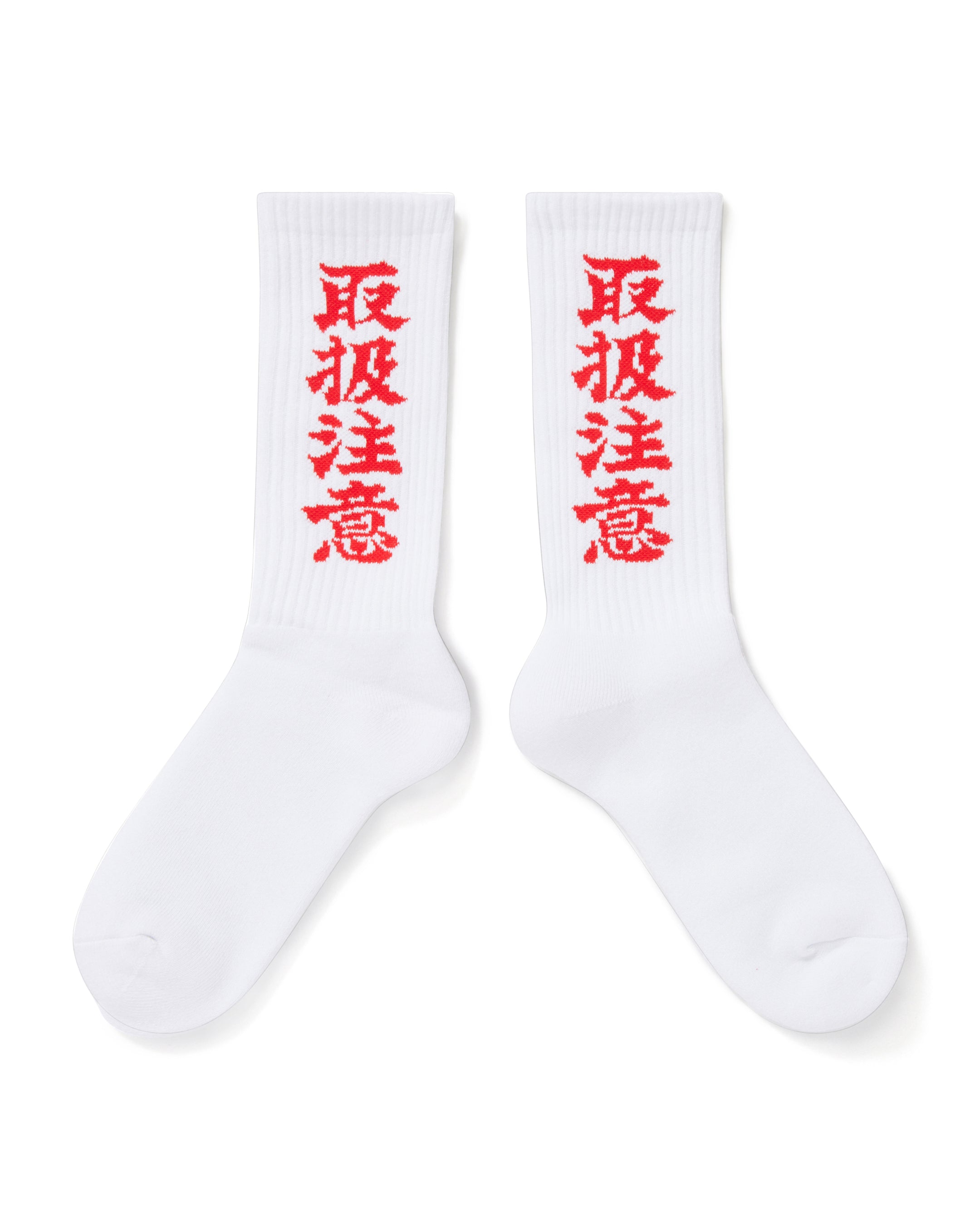 "取扱注意" のデザインを編み込んだリブ編みのソックス。