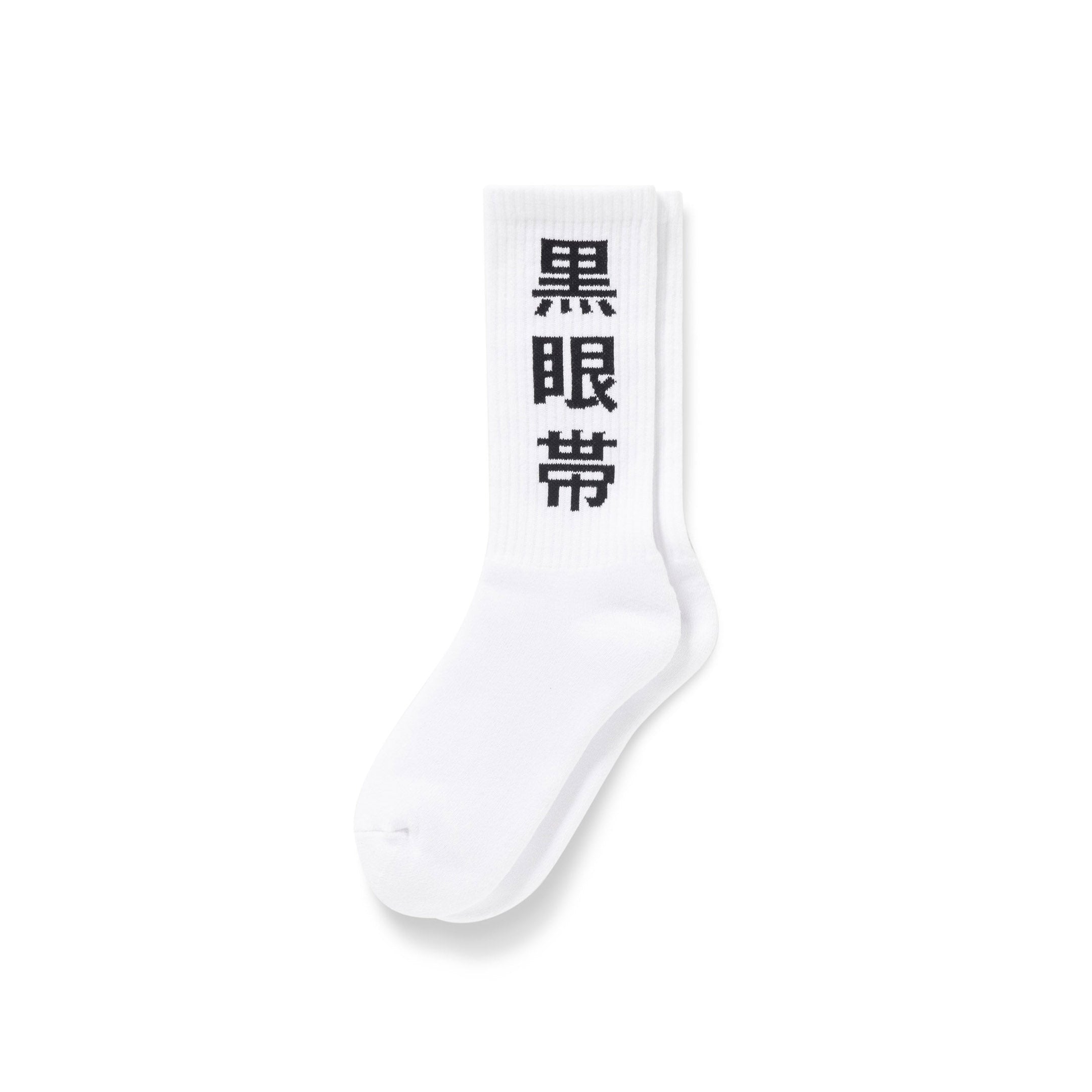 "黒眼帯" のグラフィックを編み込んだリブ編みのソックス。