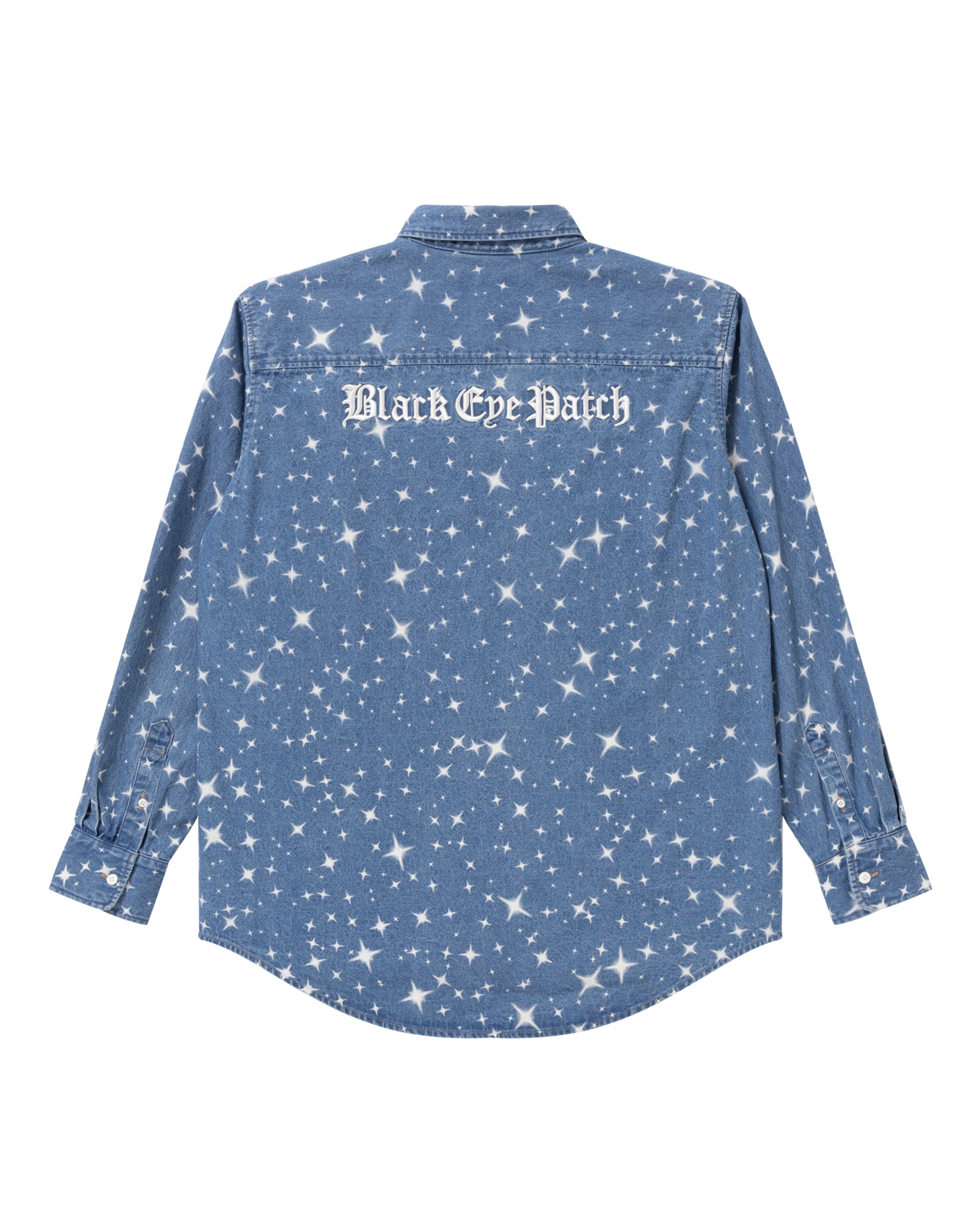 生地の染色を特殊なインクで抜く抜染加工を用いて星柄を表現した総柄のボタンダウンデニムシャツ。
