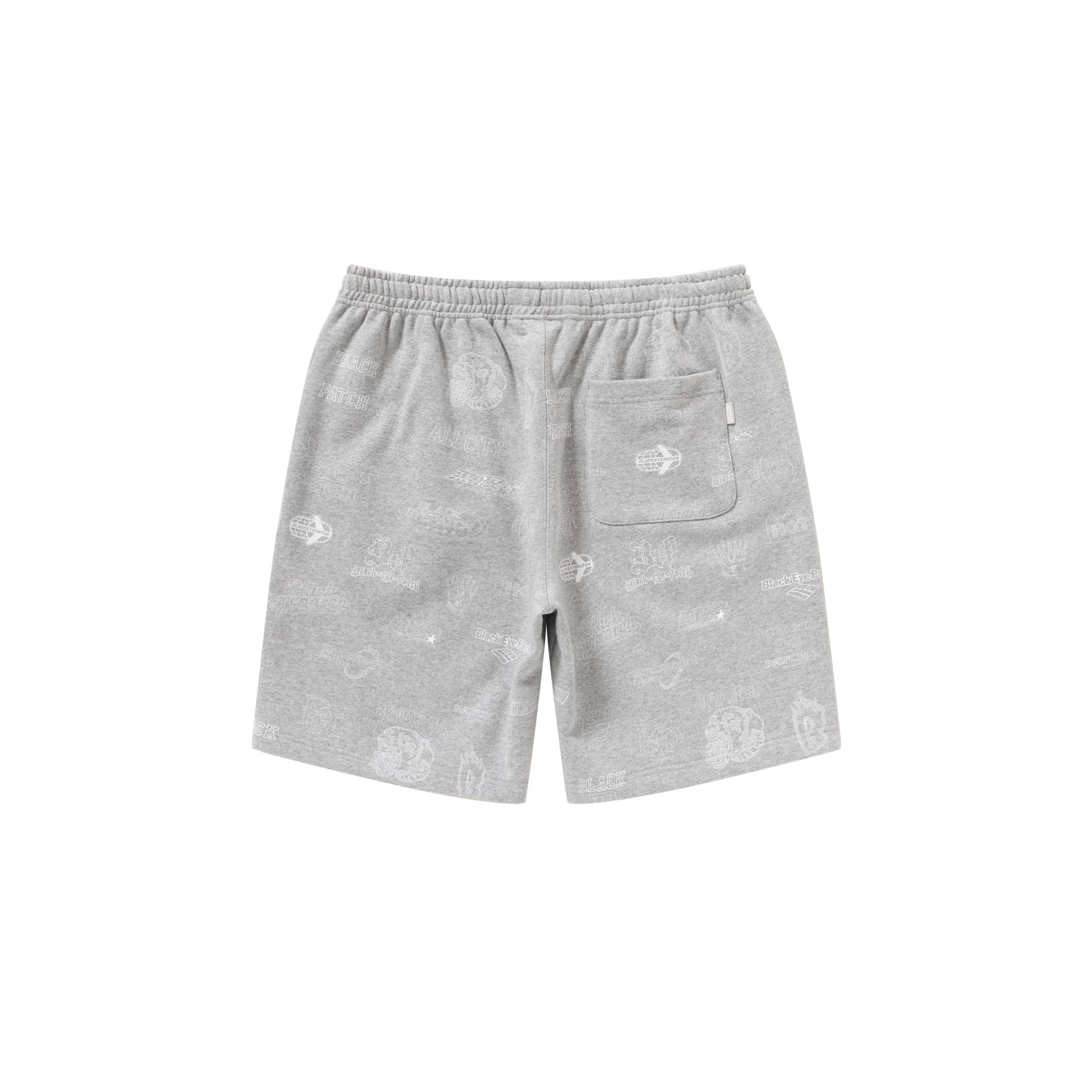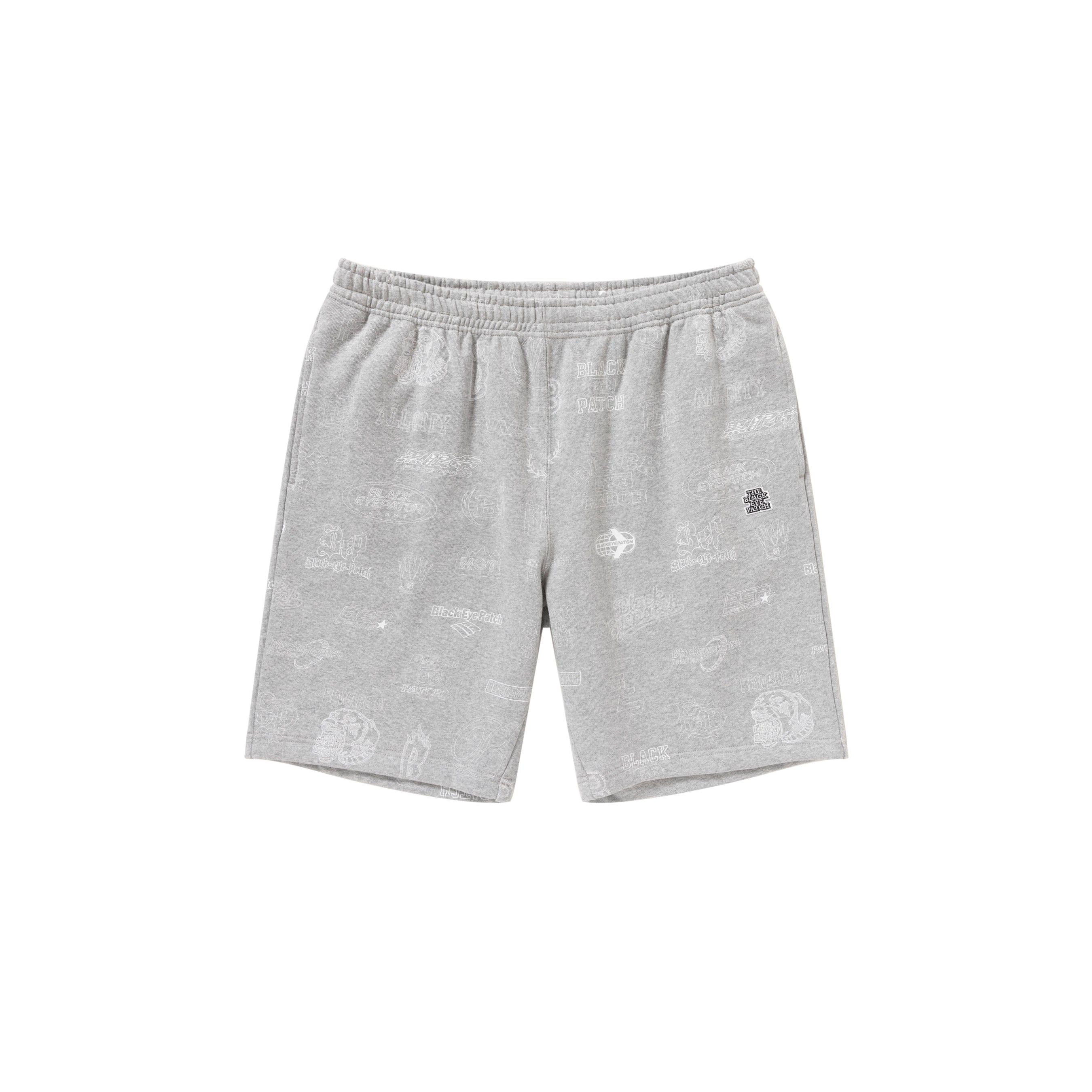 BlackEyePatch のこれまでののロゴアーカイブがドローイングでテキスタイルに落とし込まれた総柄のスウェットショーツ。