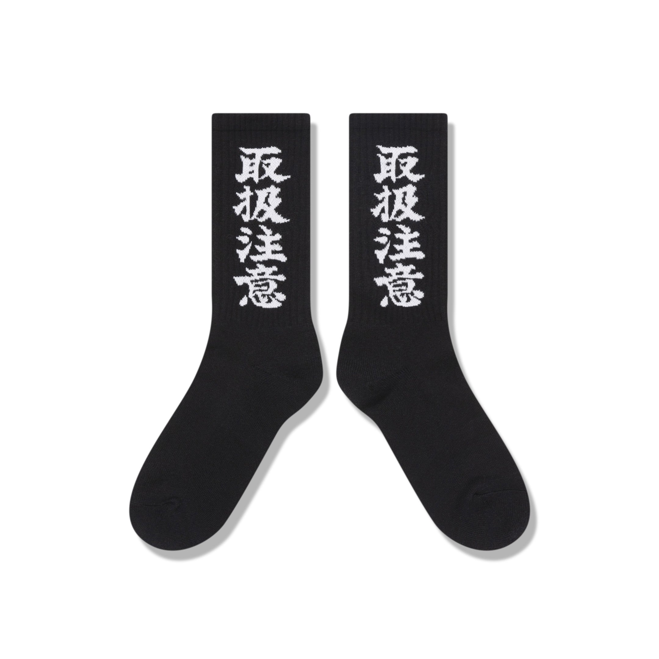 定番の "取扱注意" のグラフィックが織り込まれたソックス。