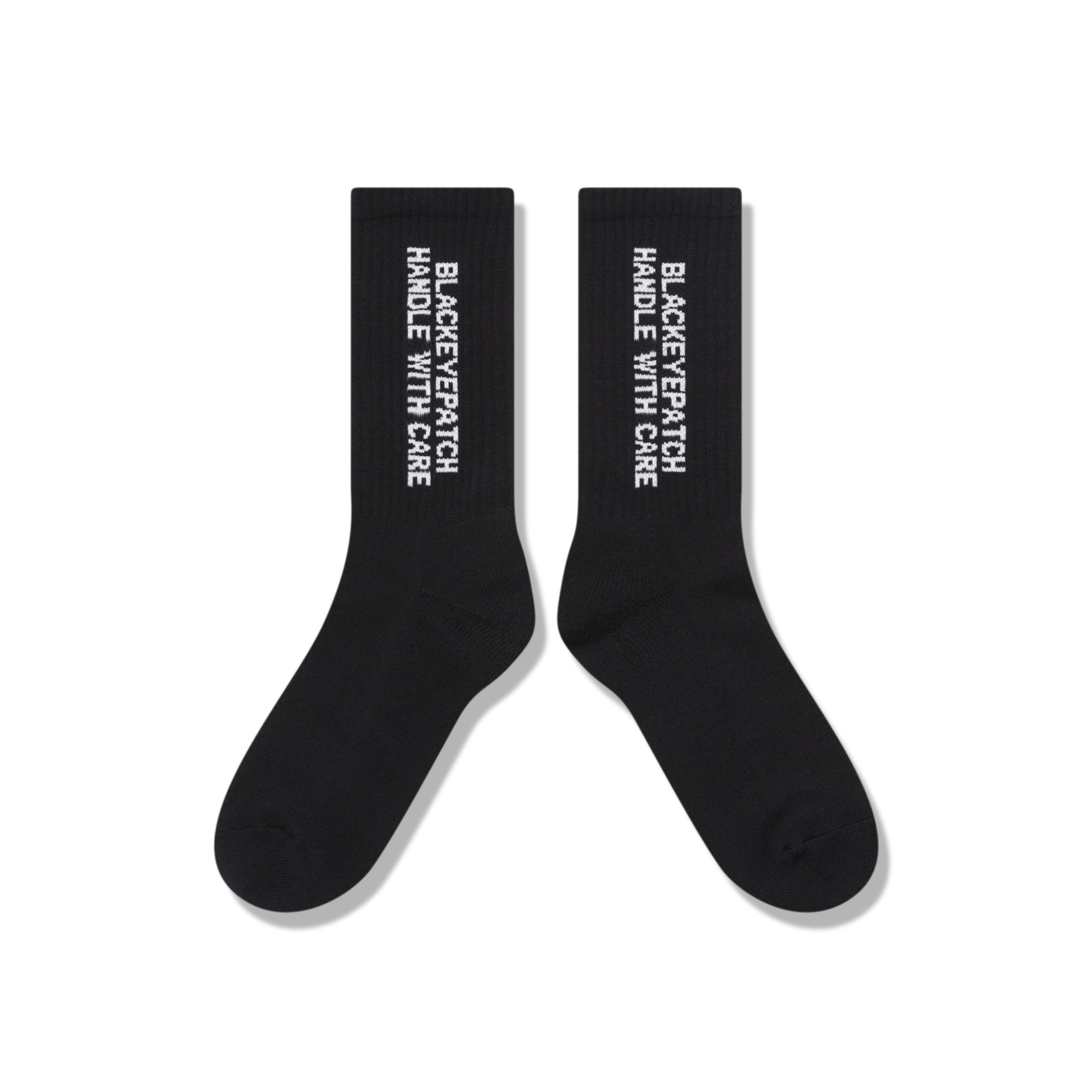 Socks featuring the standard “Handle With Care” graphic woven into them.
