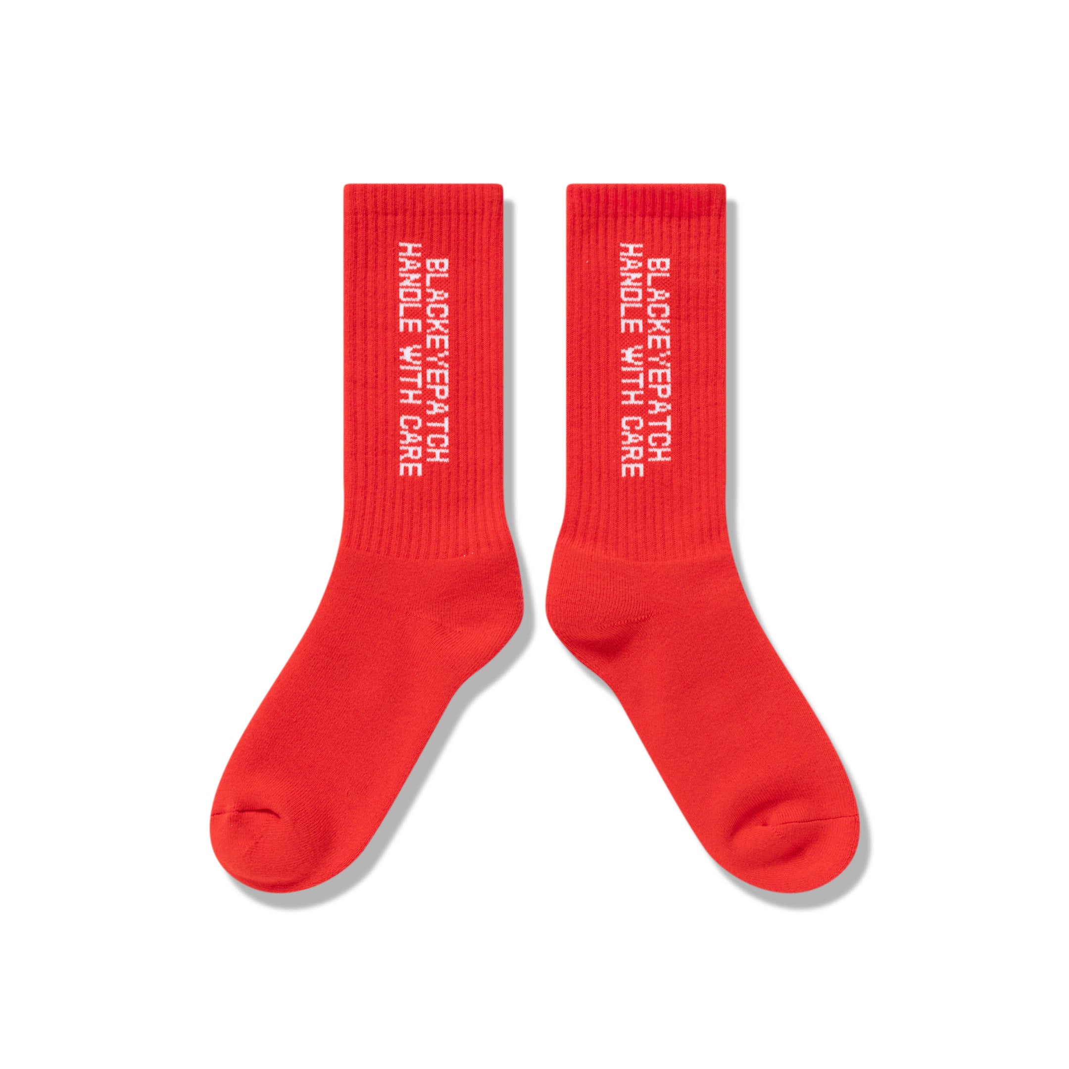 Socks featuring the standard “Handle With Care” graphic woven into them.