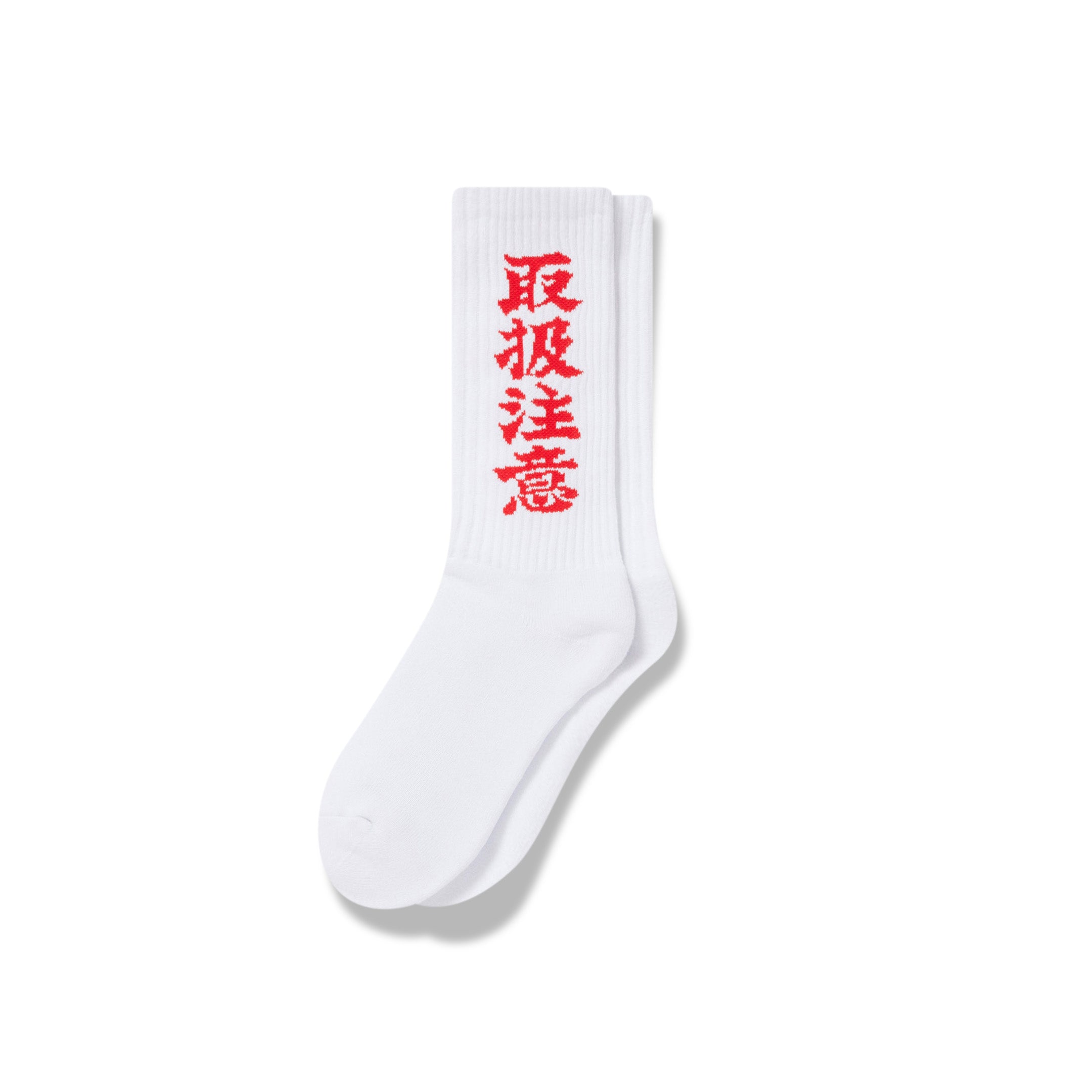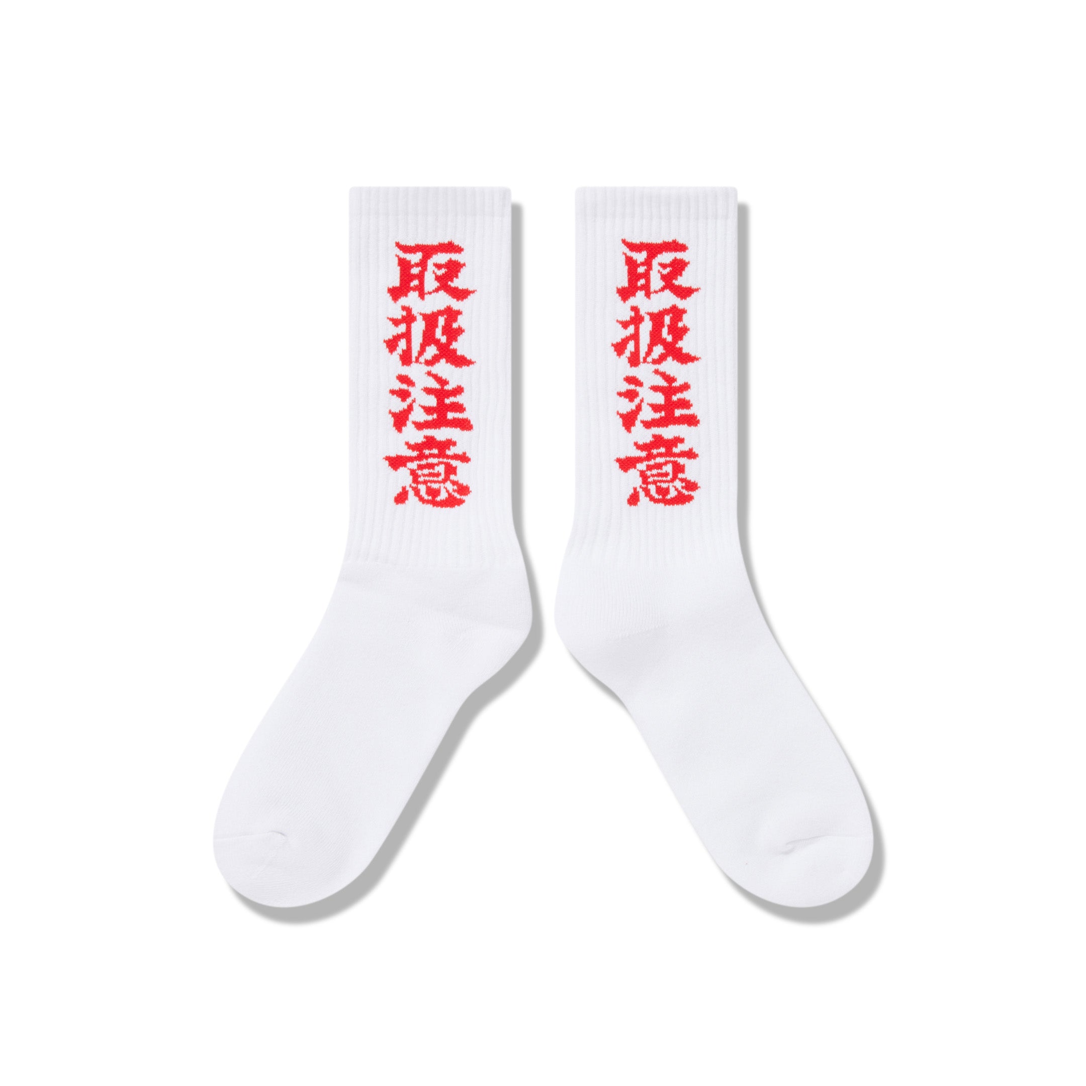 定番の "取扱注意" のグラフィックが織り込まれたソックス。
